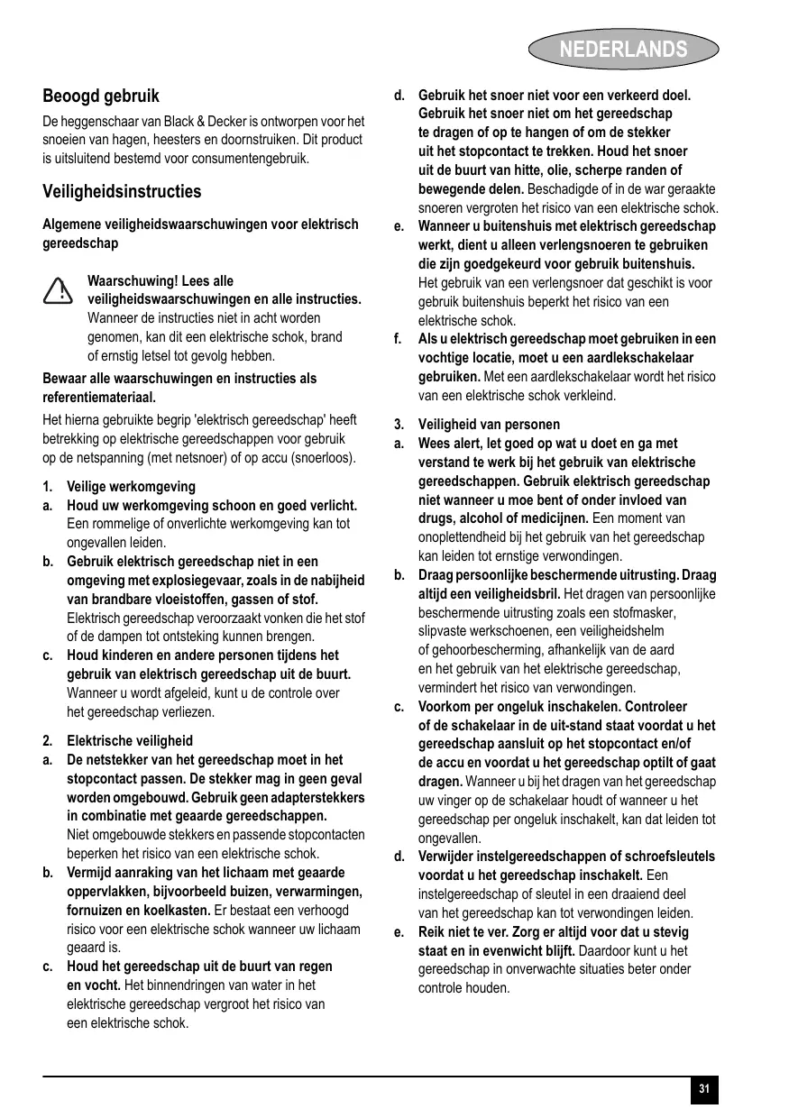 Veiligheidswaarschuwingen voor de heggenschaar. Zorg ervoor dat geen enkel onderdeel van het lichaam in aanraking kan komen met het snijblad. Verwijder geen gesnoeid materiaal en houd geen materiaal dat gesneden moet worden vast wanneer de bladen in beweging zijn. Zorg ervoor dat het apparaat is uitgeschakeld wanneer vastgelopen materiaal wordt verwijderd. Een moment van onoplettendheid tijdens de bediening van de heggenschaar kan leiden tot ernstig persoonlijk letsel. Houd de heggenschaar bij de handgreep vast terwijl het snijblad stilstaat. Wanneer de heggenschaar wordt vervoerd of opgeborgen, dient altijd de omslag voor het snijapparaat te worden gebruikt. Wanneer het apparaat op de juiste wijze wordt behandeld, verkleint u de kans op persoonlijk letsel door de snijbladen. Houd het snoer van het snijgebied verwijderd. Tijdens de bediening kan het snoer in de struiken verstopt raken en per ongeluk door het snijblad worden doorgesneden. Zorg ervoor dat u tijdens het snoeien niet in de buurt komt van hard materiaal (zoals metalen snoeren, railings). Indien u per ongeluk op dergelijk materiaal stuit, schakel het apparaat dan onmiddellijk uit en controleer het op schade. Houd het apparaat altijd met beide handen aan de daartoe bestemde hendels vast. Dit gereedschap mag niet worden gebruikt door personen (waaronder kinderen) die lichamelijk of geestelijk minder valide zijn of geen ervaring met of kennis van dit gereedschap hebben, tenzij ze onder toezicht staan of instructies krijgen wat betreft het gebruik van het gereedschap van een persoon die verantwoordelijk is voor hun veiligheid. Houd toezicht op kinderen om ervoor te zorgen dat zij niet met het apparaat gaan spelen. In deze instructiehandleiding wordt ingegaan op het beoogde gebruik. Het gebruik van andere accessoires of hulpstukken en het uitvoeren van andere handelingen met dit gereedschap dan aanbevolen in deze gebruikershandleiding, kan leiden tot persoonlijk letsel en/of schade aan eigendom.