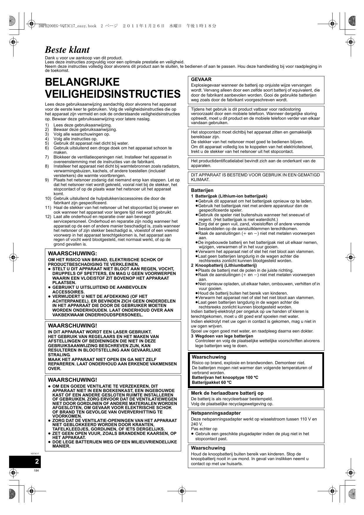 Batterijen 1 Batterijpak (Lithium-ion batterijpak) ≥Gebruik dit apparaat om het batterijpak opnieuw op te laden. ≥Gebruik het batterijpak niet met andere apparatuur dan de gespecificeerde speler. ≥Gebruik de speler niet buitenshuis wanneer het sneeuwt of regent. (Het batterijpak is niet waterdicht.) ≥Zorg dat er geen vuil, zand, vloeistoffen of andere vreemde bestanddelen op de aansluitklemmen terechtkomen. ≥Raak de aansluitingen (i en j) niet met metalen voorwerpen aan. ≥De ingebouwde batterij en het batterijpak niet uit elkaar nemen, wijzigen, verwarmen of in het vuur gooien. ≥Verwarm het apparaat niet of stel het niet bloot aan vlammen. ≥Laat geen batterijen langdurig in de wagen achter die rechtsreeks zonlicht kunnen blootgesteld worden. 2 Knoopbatterij (Lithiumbatterij) ≥Plaats de batterij met de polen in de juiste richting. ≥Raak de aansluitingen (i en j) niet met metalen voorwerpen aan. ≥Niet opnieuw opladen, uit elkaar halen, ombouwen, verhitten of in vuur gooien. ≥Houd de batterij buiten het bereik van kinderen. ≥Verwarm het apparaat niet of stel het niet bloot aan vlammen. ≥Laat geen batterijen langdurig in de wagen achter die rechtsreeks zonlicht kunnen blootgesteld worden. Indien batterij-elektrolyt per ongeluk op uw handen of kleren is terechtgekomen, moet u dit goed eraf spoelen met water. Indien elektrolyt met uw ogen in contact is gekomen, mag u niet in uw ogen wrijven. Spoel uw ogen goed met water, en raadpleeg daarna een dokter. 3 Wegdoen van lege batterijen Controleer en volg de plaatselijke wettelijke voorschriften alvorens lege batterijen weg te doen.