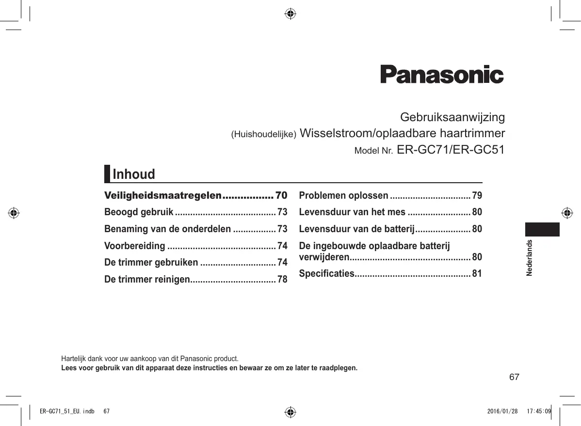 Gebruiksaanwijzing (Huishoudelijke) Wisselstroom/oplaadbare haartrimmer Model Nr. ER‑GC71/ER‑GC51 Veiligheidsmaatregelen 70