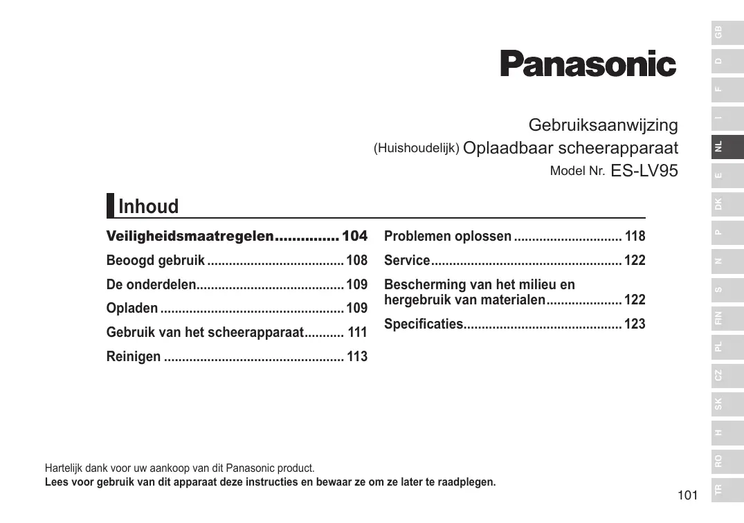 Hartelijk dank voor uw aankoop van dit Panasonic product. Lees voor gebruik van dit apparaat deze instructies en bewaar ze om ze later te raadplegen.