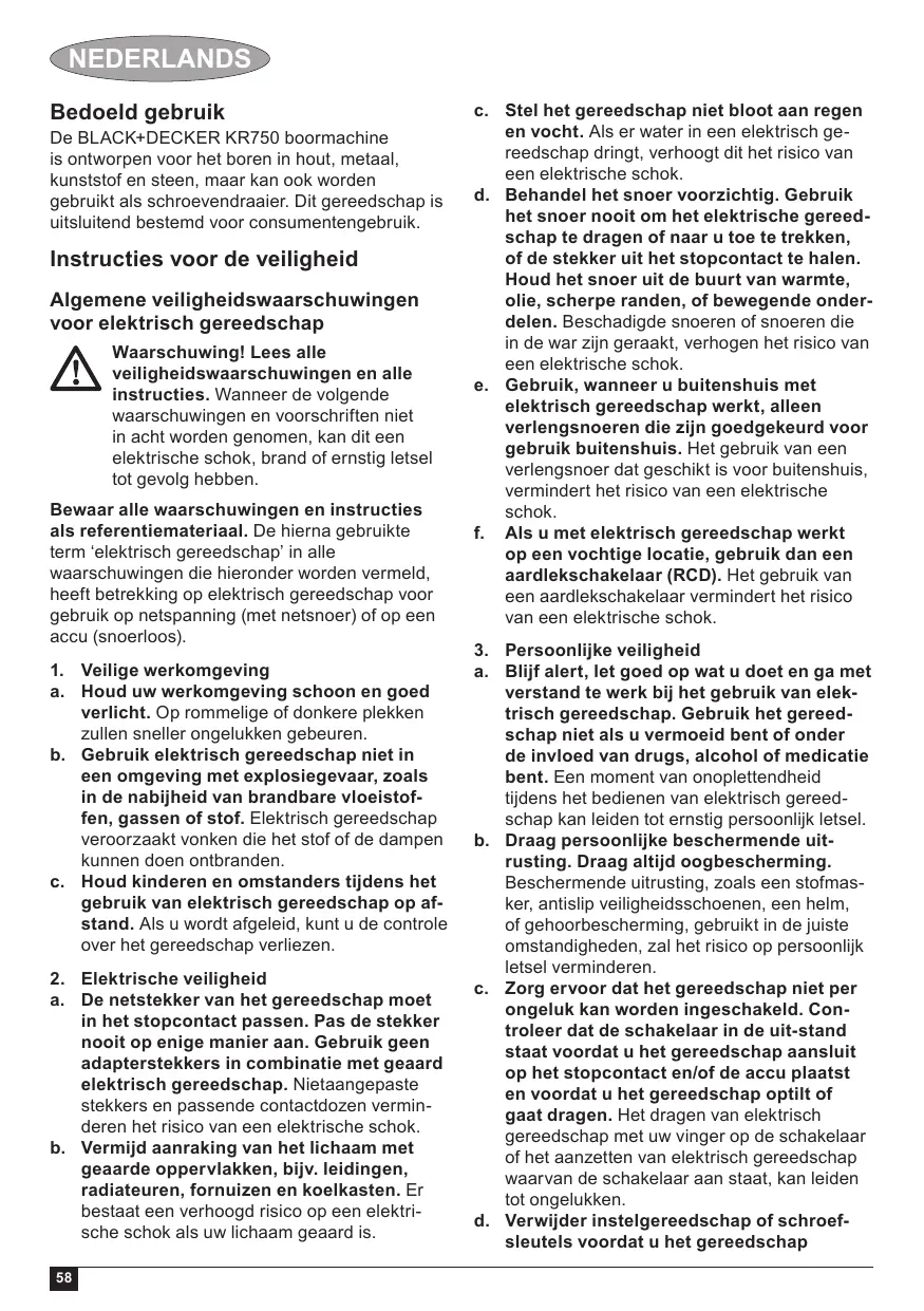 NEDERLANDS Bedoeld gebruik De BLACK+DECKER KR750 boormachine is ontworpen voor het boren in hout, metaal, kunststof en steen, maar kan ook worden gebruikt als schroevendraaier. Dit gereedschap is uitsluitend bestemd voor consumentengebruik.