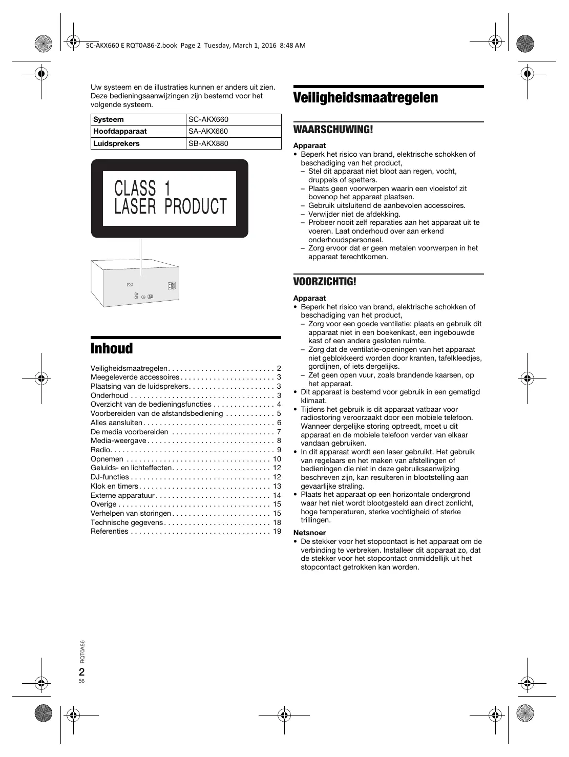SC-AKX660 E RQT0A86-Z.book Page 2 Tuesday, March 1, 2016 8:48 AM Uw systeem en de illustraties kunnen er anders uit zien. Deze bedieningsaanwijzingen zijn bestemd voor het volgende systeem. Veiligheidsmaatregelen Systeem SC-AKX660 Hoofdapparaat SA-AKX660 WAARSCHUWING! Luidsprekers SB-AKX880 Apparaat