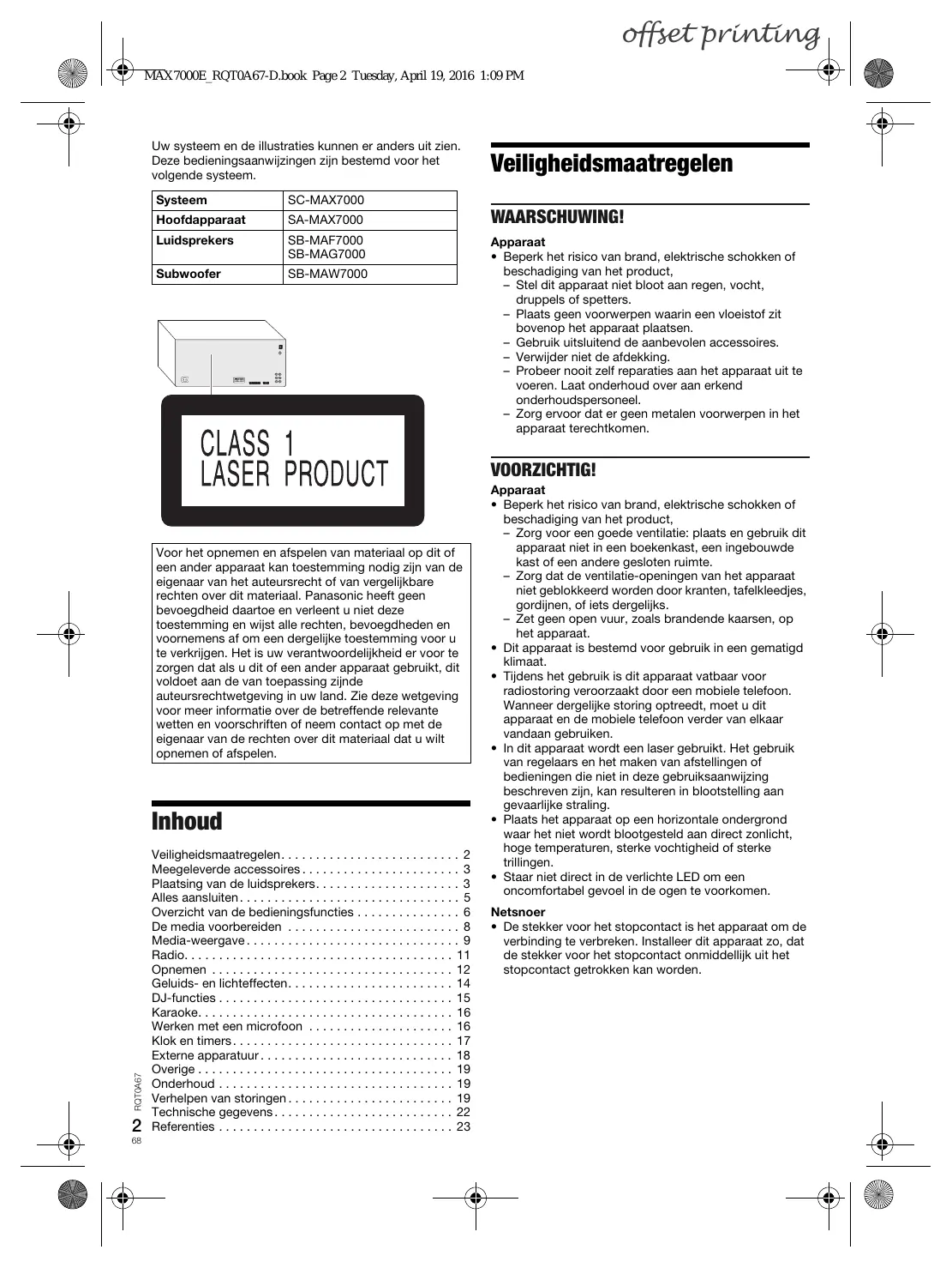 offset printing MAX7000E_RQT0A67-D.book Page 2 Tuesday, April 19, 2016 1:09 PM Uw systeem en de illustraties kunnen er anders uit zien. Deze bedieningsaanwijzingen zijn bestemd voor het volgende systeem. Veiligheidsmaatregelen Systeem SC-MAX7000 Hoofdapparaat SA-MAX7000 WAARSCHUWING! Luidsprekers SB-MAF7000 SB-MAG7000 Subwoofer SB-MAW7000 Apparaat