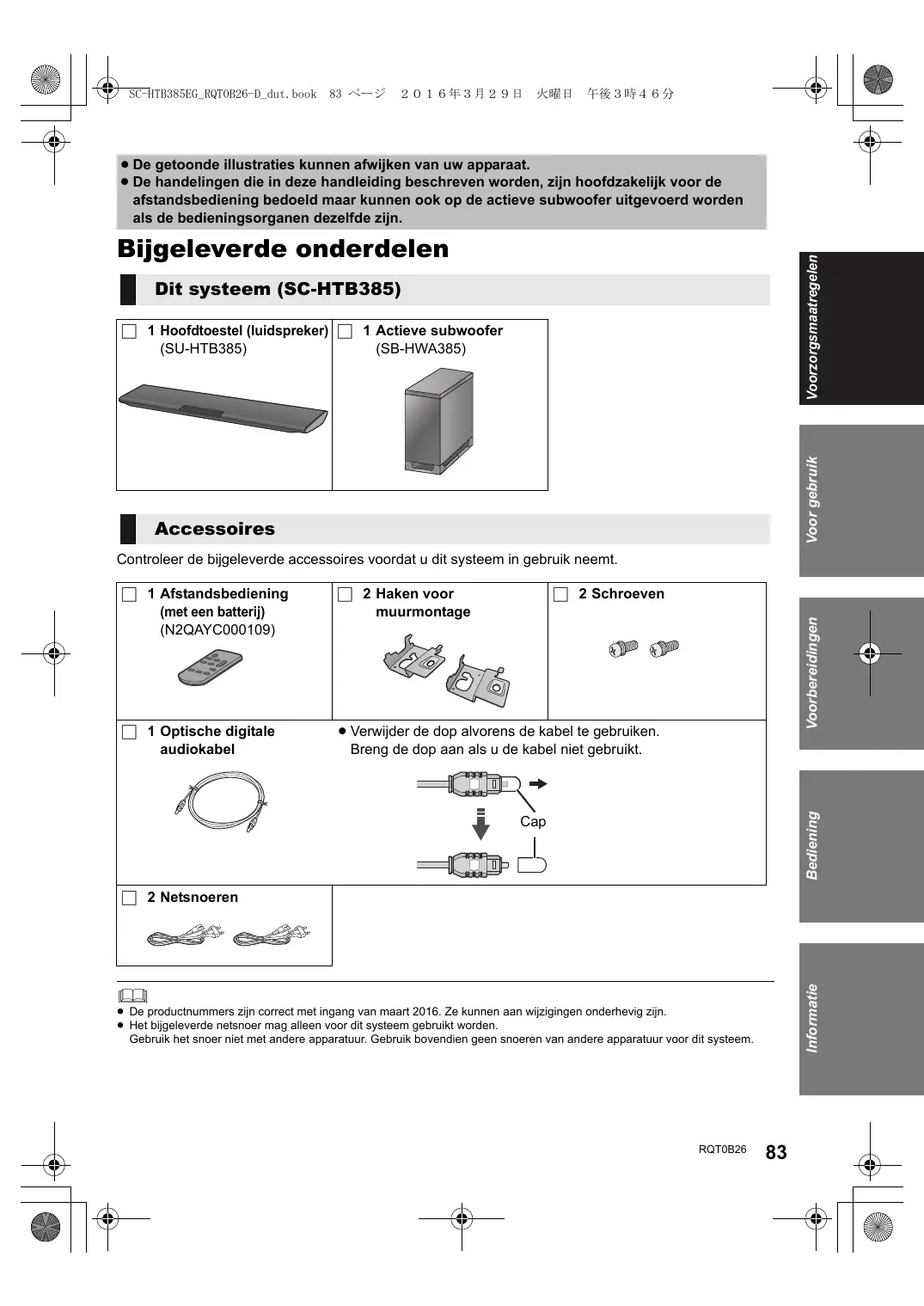 Voor gebruik ≥ De getoonde illustraties kunnen afwijken van uw apparaat. ≥ De handelingen die in deze handleiding beschreven worden, zijn hoofdzakelijk voor de afstandsbediening bedoeld maar kunnen ook op de actieve subwoofer uitgevoerd worden als de bedieningsorganen dezelfde zijn. Voorzorgsmaatregelen Bijgeleverde onderdelen Dit systeem (SC-HTB385) Voor gebruik ∏ 1 Hoofdtoestel (luidspreker) ∏ 1 Actieve subwoofer (SU-HTB385) (SB-HWA385) Accessoires Controleer de bijgeleverde accessoires voordat u dit systeem in gebruik neemt. ∏ 2 Schroeven ∏ 1 Optische digitale audiokabel ≥ Verwijder de dop alvorens de kabel te gebruiken. Breng de dop aan als u de kabel niet gebruikt. Voorbereidingen ∏ 2 Haken voor muurmontage Bediening ∏ 1 Afstandsbediening (met een batterij) (N2QAYC000109) Cap Informatie ∏ 2 Netsnoeren ≥ De productnummers zijn correct met ingang van maart 2016. Ze kunnen aan wijzigingen onderhevig zijn. ≥ Het bijgeleverde netsnoer mag alleen voor dit systeem gebruikt worden. Gebruik het snoer niet met andere apparatuur. Gebruik bovendien geen snoeren van andere apparatuur voor dit systeem. RQT0B26