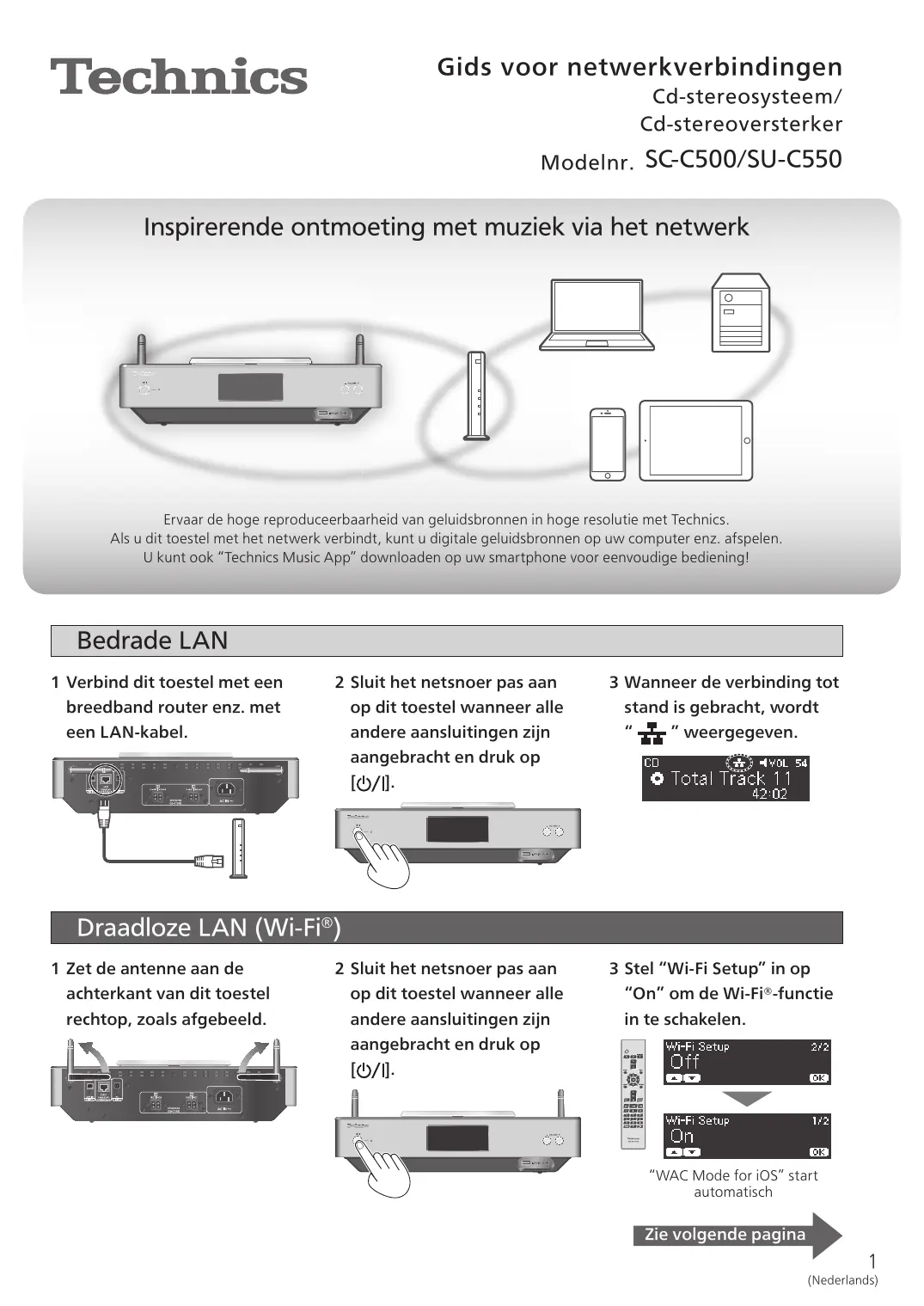 (Italiano) Gids voor netwerkverbindingen Cd-stereosysteem/ Cd-stereoversterker Modelnr. SC-C500/SU-C550 Inspirerende ontmoeting met muziek via het netwerk Ervaar de hoge reproduceerbaarheid van geluidsbronnen in hoge resolutie met Technics. Als u dit toestel met het netwerk verbindt, kunt u digitale geluidsbronnen op uw computer enz. afspelen. U kunt ook “Technics Music App” downloaden op uw smartphone voor eenvoudige bediening! Bedrade LAN 1 Verbind dit toestel met een 2 Sluit het netsnoer pas aan 3 Wanneer de verbinding tot breedband router enz. met op dit toestel wanneer alle stand is gebracht, wordt een LAN-kabel. andere aansluitingen zijn