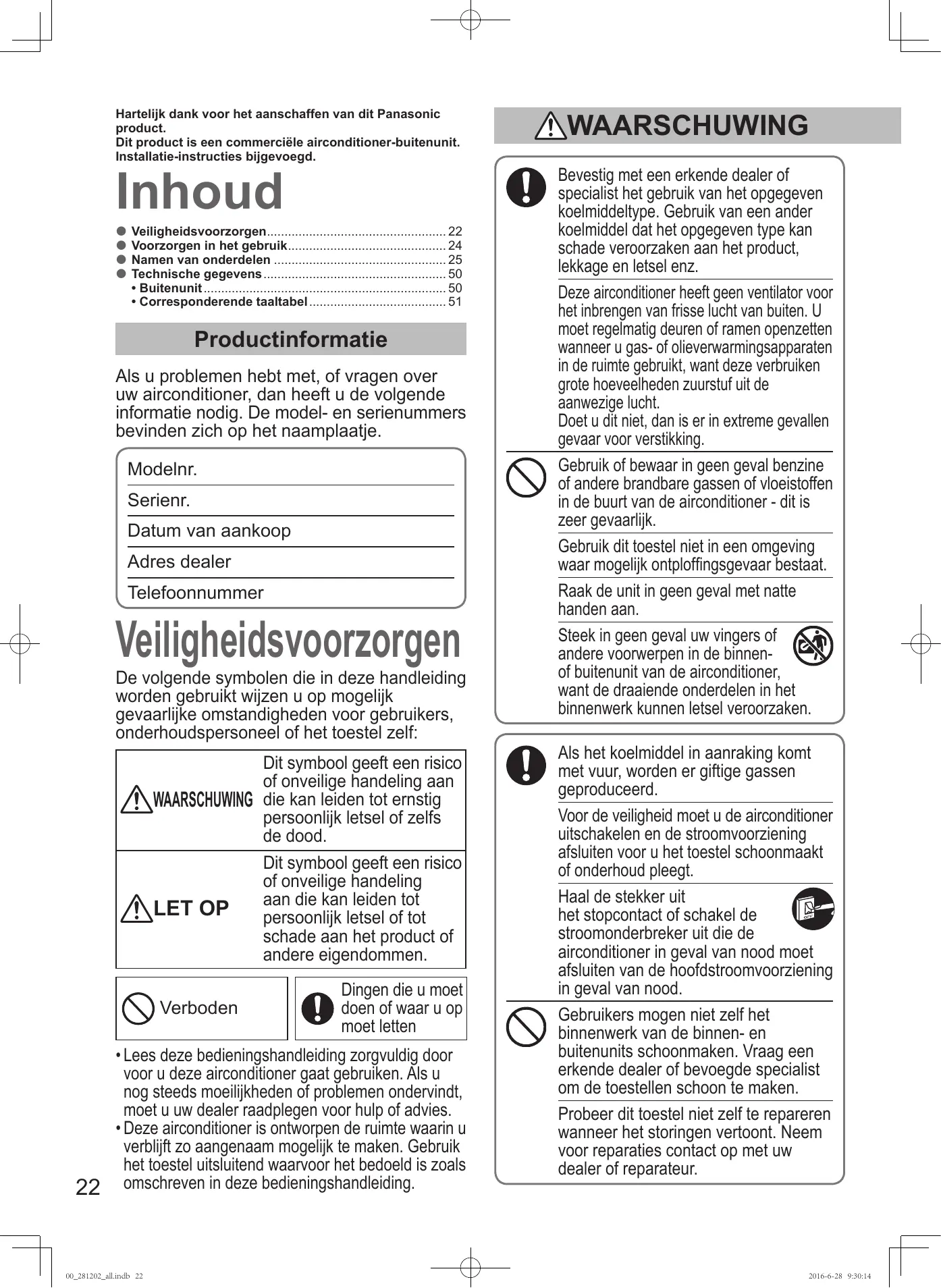 - 00_281202_all.indb 21 2016-6-28 9:30:13 Hartelijk dank voor het aanschaffen van dit Panasonic product. Dit product is een commerciële airconditioner-buitenunit. Installatie-instructies bijgevoegd. Inhoud Veiligheidsvoorzorgen p. 22