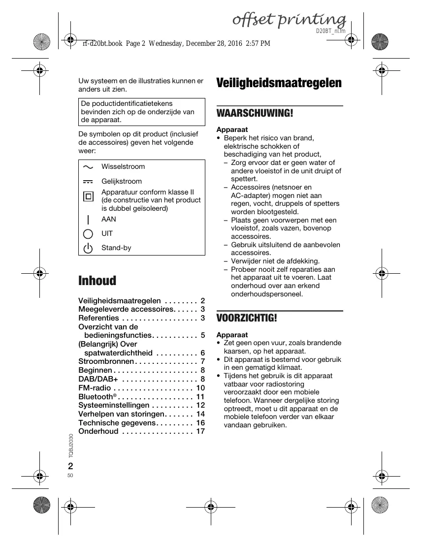 offset printing D20BT_nl.fm rf-d20bt.book Page 2 Wednesday, December 28, 2016 2:57 PM Uw systeem en de illustraties kunnen er anders uit zien. De poductidentificatietekens bevinden zich op de onderzijde van de apparaat. De symbolen op dit product (inclusief de accessoires) geven het volgende weer: Wisselstroom Gelijkstroom Apparatuur conform klasse II (de constructie van het product is dubbel geïsoleerd) AAN UIT Stand-by TQBJ2030 Inhoud