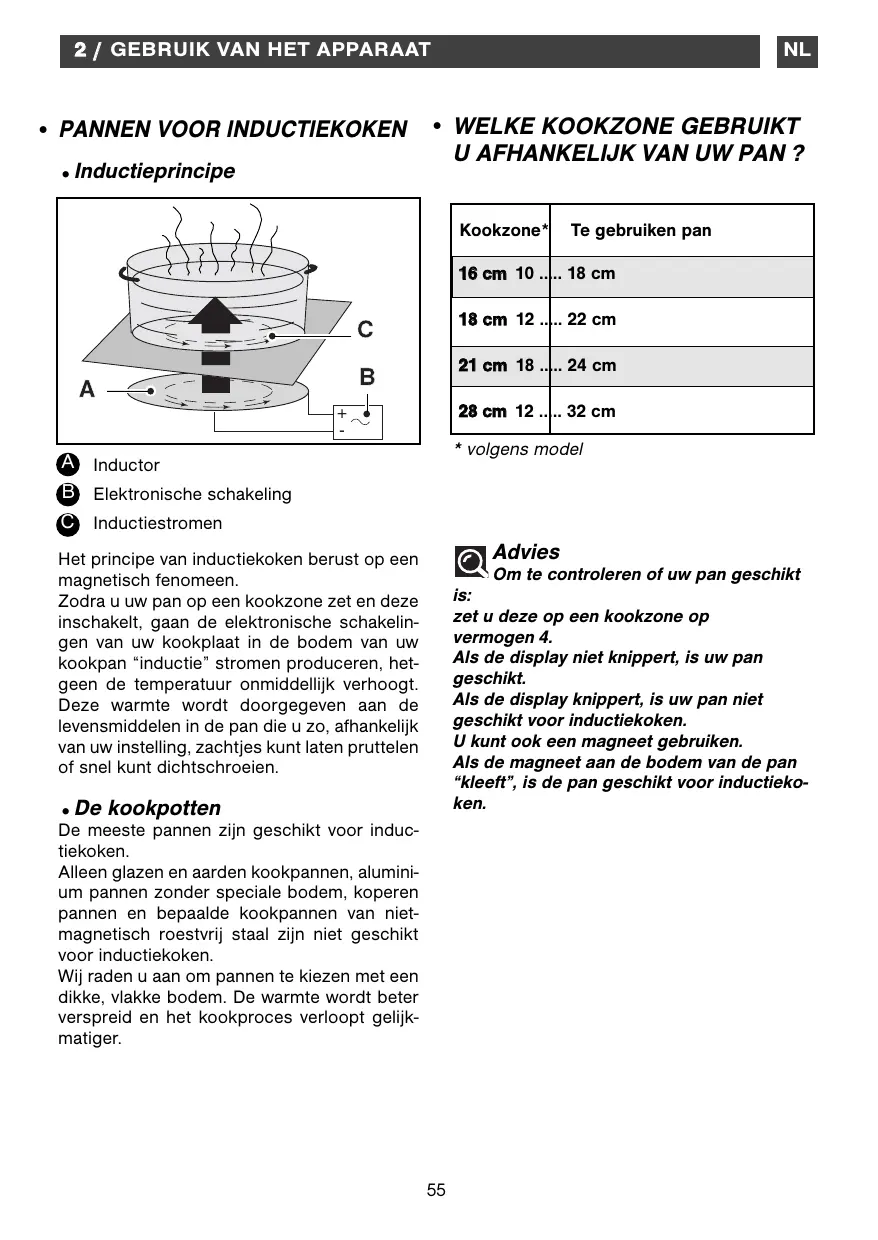 - volgens model A Inductor B Elektronische schakeling C Inductiestromen Advies Het principe van inductiekoken berust op een magnetisch fenomeen. Zodra u uw pan op een kookzone zet en deze inschakelt, gaan de elektronische schakelingen van uw kookplaat in de bodem van uw kookpan “inductie” stromen produceren, hetgeen de temperatuur onmiddellijk verhoogt. Deze warmte wordt doorgegeven aan de levensmiddelen in de pan die u zo, afhankelijk van uw instelling, zachtjes kunt laten pruttelen of snel kunt dichtschroeien. Om te controleren of uw pan geschikt is: zet u deze op een kookzone op vermogen 4. Als de display niet knippert, is uw pan geschikt. Als de display knippert, is uw pan niet geschikt voor inductiekoken. U kunt ook een magneet gebruiken. Als de magneet aan de bodem van de pan “kleeft”, is de pan geschikt voor inductiekoken.
