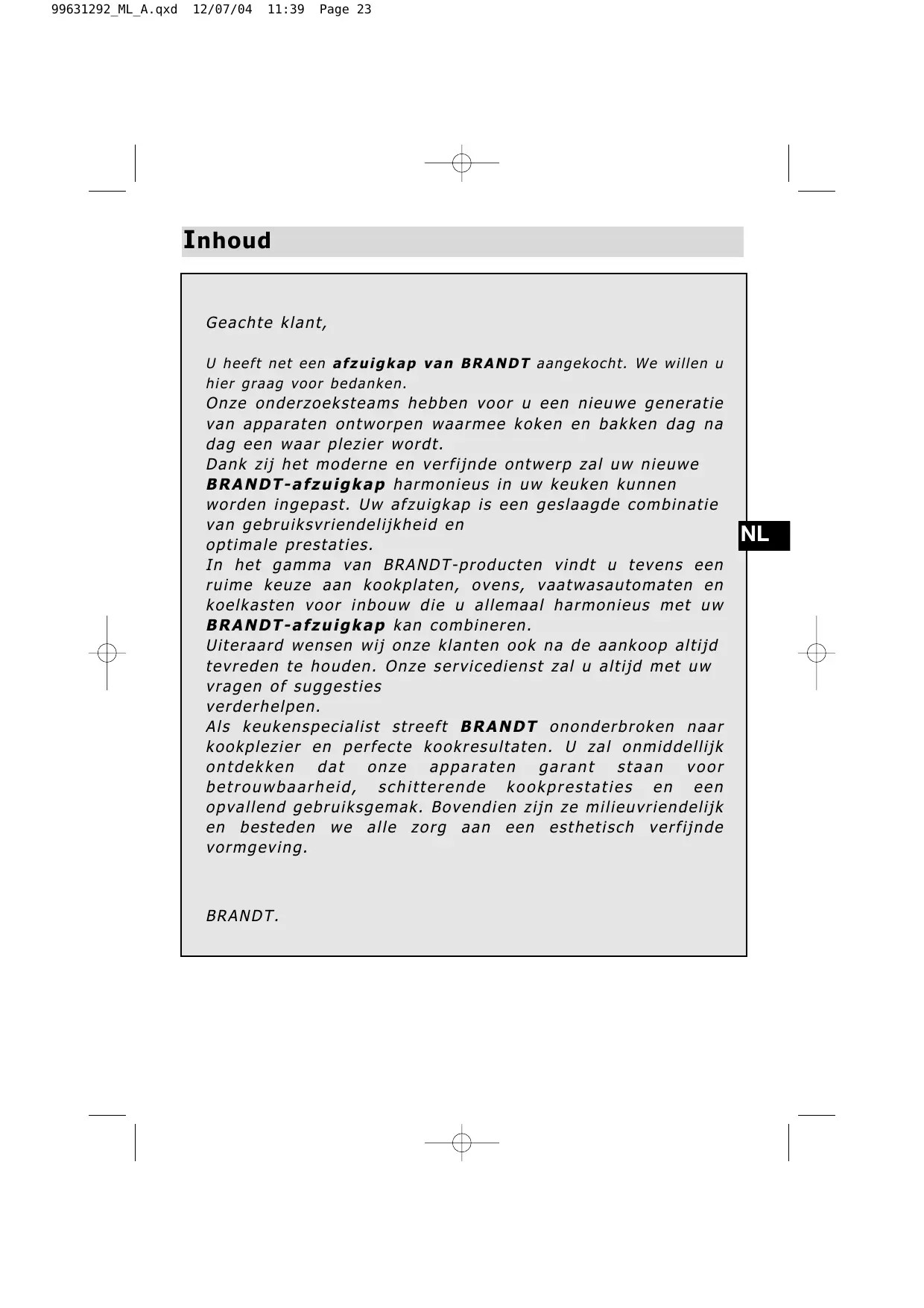 99631292_ML_A.qxd 12/07/04 11:39 Page 23 I nhoud Geachte klant, U heeft net een afzuigkap van BRANDT aangekocht. We willen u hier graag voor bedanken. Onze onderzoeksteams hebben voor u een nieuwe generatie van apparaten ontworpen waarmee koken en bakken dag na dag een waar plezier wordt. Dank zij het moderne en verfijnde ontwerp zal uw nieuwe BRANDT-afzuigkap harmonieus in uw keuken kunnen worden ingepast. Uw afzuigkap is een geslaagde combinatie van gebruiksvriendelijkheid en optimale prestaties. In het gamma van BRANDT-producten vindt u tevens een ruime keuze aan kookplaten, ovens, vaatwasautomaten en koelkasten voor inbouw die u allemaal harmonieus met uw BRANDT-afzuigkap kan combineren. Uiteraard wensen wij onze klanten ook na de aankoop altijd tevreden te houden. Onze servicedienst zal u altijd met uw vragen of suggesties verderhelpen. Als keukenspecialist streeft BRANDT ononderbroken naar kookplezier en perfecte kookresultaten. U zal onmiddellijk ontdekken dat onze apparaten garant staan voor betrouwbaarheid, schitterende kookprestaties en een opvallend gebruiksgemak. Bovendien zijn ze milieuvriendelijk en besteden we alle zorg aan een esthetisch verfijnde vormgeving. BRANDT.
