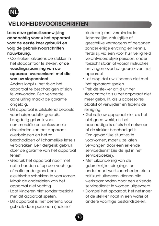• Avant de brancher cet appareil dans la prise secteur, vérifiez que la tension d'alimentation de votre appareil correspond bien à celle de votre installation électrique. Sinon, vous risquez d'endommager l'appareil ou de vous blesser. Toute erreur de branchement annule la garantie. • Cet appareil est destiné uniquement à un usage domestique. Son utilisation prolongée à des fins commerciales et professionnelles risque de surcharger l'appareil et d'endommager celui-ci ou de provoquer des blessures corporelles. Une utilisation dans de telles conditions annule la garantie de l'appareil. • Pour éviter les chocs électriques, n'utilisez jamais l'appareil avec les mains mouillées ou sur une surface humide ou mouillée. Evitez de mouiller les composants électriques de l'appareil et ne les plongez jamais dans l'eau. • Ne pas laisser les enfants utiliser l’appareil sans surveillance. • Cet appareil n'est pas prévu pour