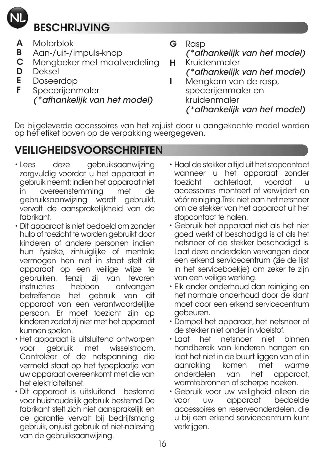 NL A B C D E F BESCHRIJVING Motorblok Aan-/uit-/impuls-knop Mengbeker met maatverdeling Deksel Doseerdop Specerijenmaler (*afhankelijk van het model)