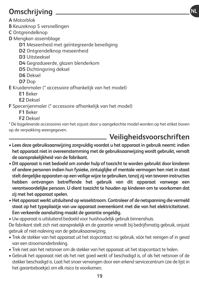 - Directives Basse Tension • Toute intervention, autre que le nettoyage et l'entretien usuel par le client, doit être effectuée par un centre service agréé. • Pour votre sécurité, n'utilisez que des accessoires et des pièces de rechange fournis par les centres service agréés. Attention : aucun accessoire ne pourra vous être vendu sans présentation de votre notice d’utilisation ou de votre appareil. • Ne mettez pas l'appareil, le câble d'alimentation ou la fiche dans du liquide. • Ne laissez pas le câble d'alimentation pendre à portée de mains des enfants, être à proximité ou en contact avec les parties chaudes de l'appareil, près d'une source de chaleur ou sur un angle vif. • Ne passez pas les accessoires contenant du métal au micro-ondes. • Des précautions doivent être prises lors de la manipulation des couteaux affutés du bloc lames (D1), du moulin à fines herbes (E), du moulin à épices (F), lorsqu'on vide les bols et lors du nettoyage : ils sont extrêmement coupants. • Ne touchez jamais les pièces en mouvement lorsque l'appareil est en fonctionnement, attendez l'arrêt complet de l'appareil et des accessoires pour intervenir ou pour enlever ces accessoires. • N'introduisez jamais d'ustensiles de cuisine (cuillère, spatule...) dans le bol (D) pendant le fonctionnement. • Ne laissez pas pendre les cheveux longs, écharpes, cravates etc.… au dessus de l'appareil ou des accessoires en fonctionnement. • Ne faites pas fonctionner le bol blender sans ingrédient, avec des produits secs uniquement ou durs (tels que des morceaux de sucre...), avec du liquide bouillant (supérieur à 80°C/176°F) ou si le couvercle (D6) équipé du joint (D5) n'est pas en place sur le bol (D). • Ne faites pas fonctionner votre appareil sans surveillance. • Versez toujours les ingrédients liquides en premier dans le bol blender avant d'ajouter les ingrédients solides, sans dépasser le niveau maximal. • Ne pas utiliser les bols comme récipients (congélation, cuisson, stérilisation). • N'utilisez pas votre appareil plus de 3 minutes en marche continue. • Placez l'appareil sur un plan de travail stable, résistant à la chaleur, propre et sec. • N'utilisez jamais cet appareil pour mélanger ou mixer des ingrédients non alimentaires.