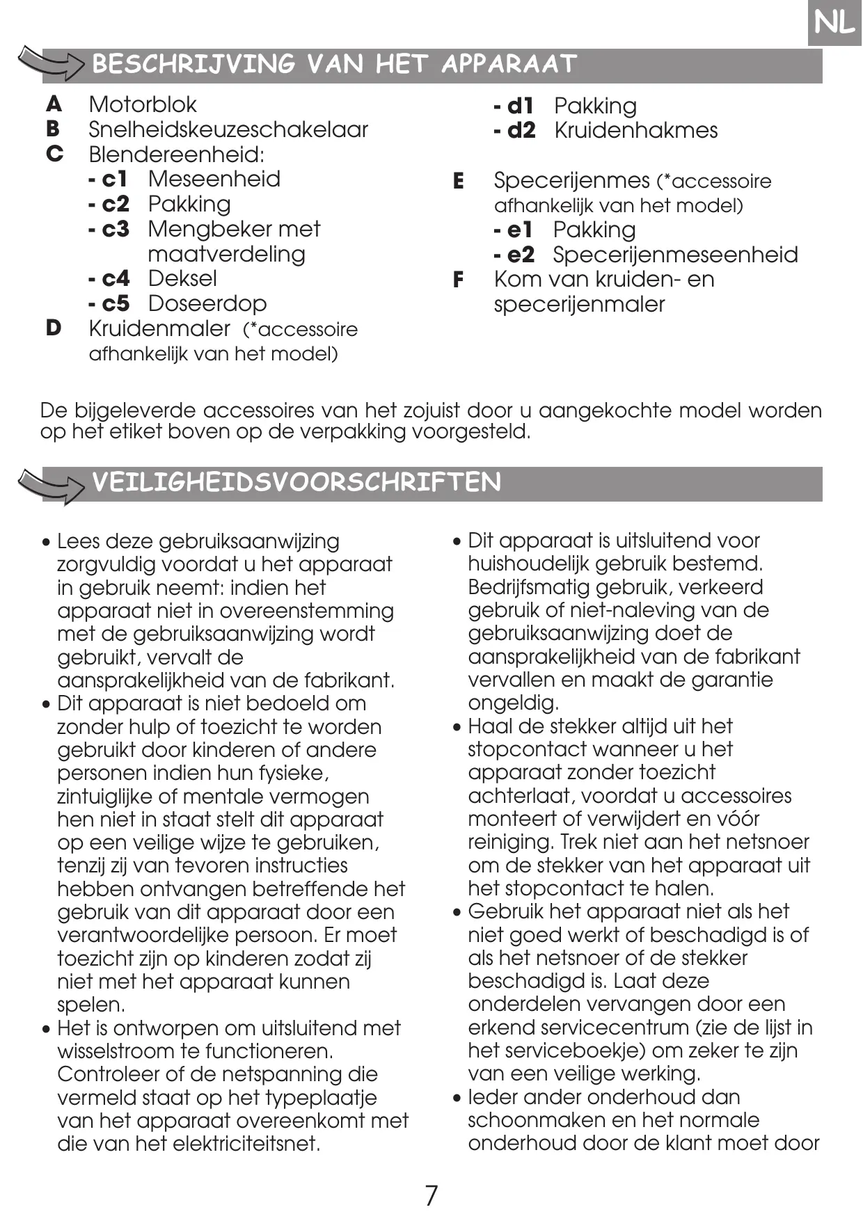 Specerijenmes (*accessoire afhankelijk van het model) - e1 Pakking - e2 Specerijenmeseenheid Kom van kruiden- en specerijenmaler afhankelijk van het model) De bijgeleverde accessoires van het zojuist door u aangekochte model worden op het etiket boven op de verpakking voorgesteld. VEILIGHEIDSVOORSCHRIFTEN