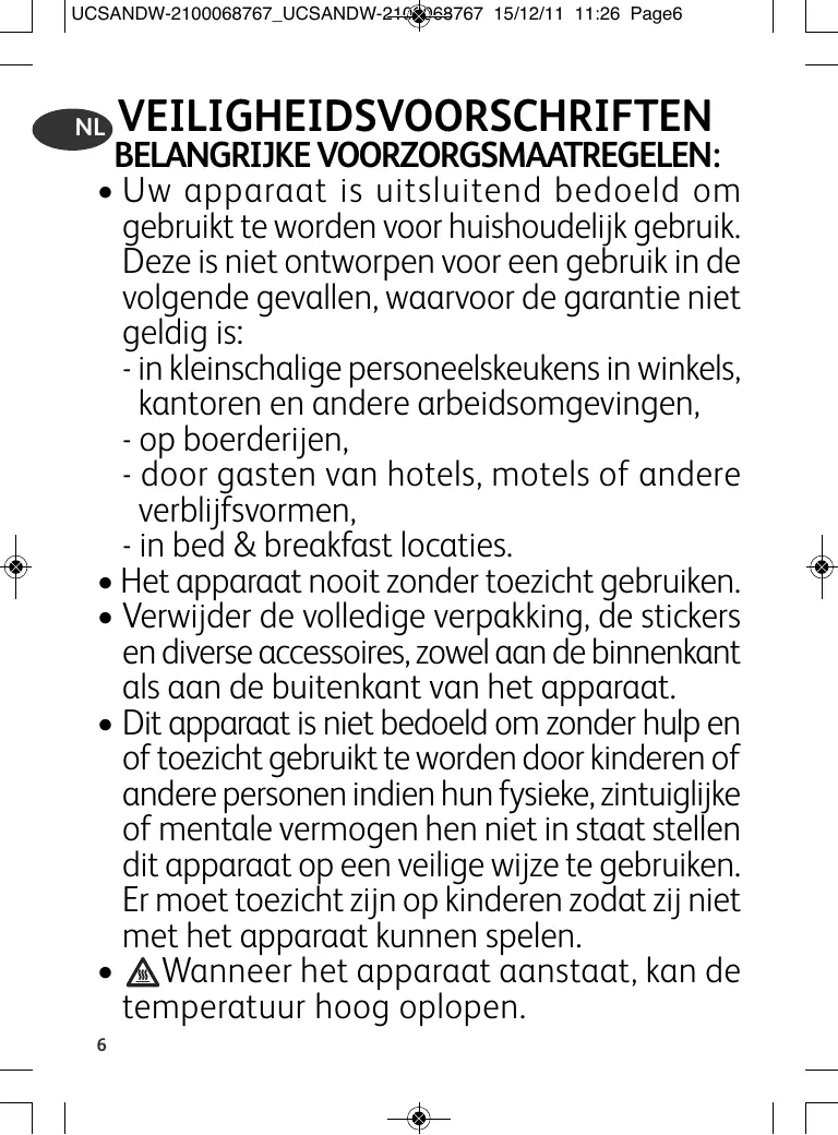 NL VEILIGHEIDSVOORSCHRIFTEN BELANGRIJKE VOORZORGSMAATREGELEN: • Uw apparaat is uitsluitend bedoeld om gebruikt te worden voor huishoudelijk gebruik. Deze is niet ontworpen voor een gebruik in de volgende gevallen, waarvoor de garantie niet geldig is: - in kleinschalige personeelskeukens in winkels, kantoren en andere arbeidsomgevingen, - op boerderijen, - door gasten van hotels, motels of andere verblijfsvormen, - in bed & breakfast locaties. • Het apparaat nooit zonder toezicht gebruiken. • Verwijder de volledige verpakking, de stickers en diverse accessoires, zowel aan de binnenkant als aan de buitenkant van het apparaat. • Dit apparaat is niet bedoeld om zonder hulp en of toezicht gebruikt te worden door kinderen of andere personen indien hun fysieke, zintuiglijke of mentale vermogen hen niet in staat stellen dit apparaat op een veilige wijze te gebruiken. Er moet toezicht zijn op kinderen zodat zij niet met het apparaat kunnen spelen. • Wanneer het apparaat aanstaat, kan de temperatuur hoog oplopen. 6