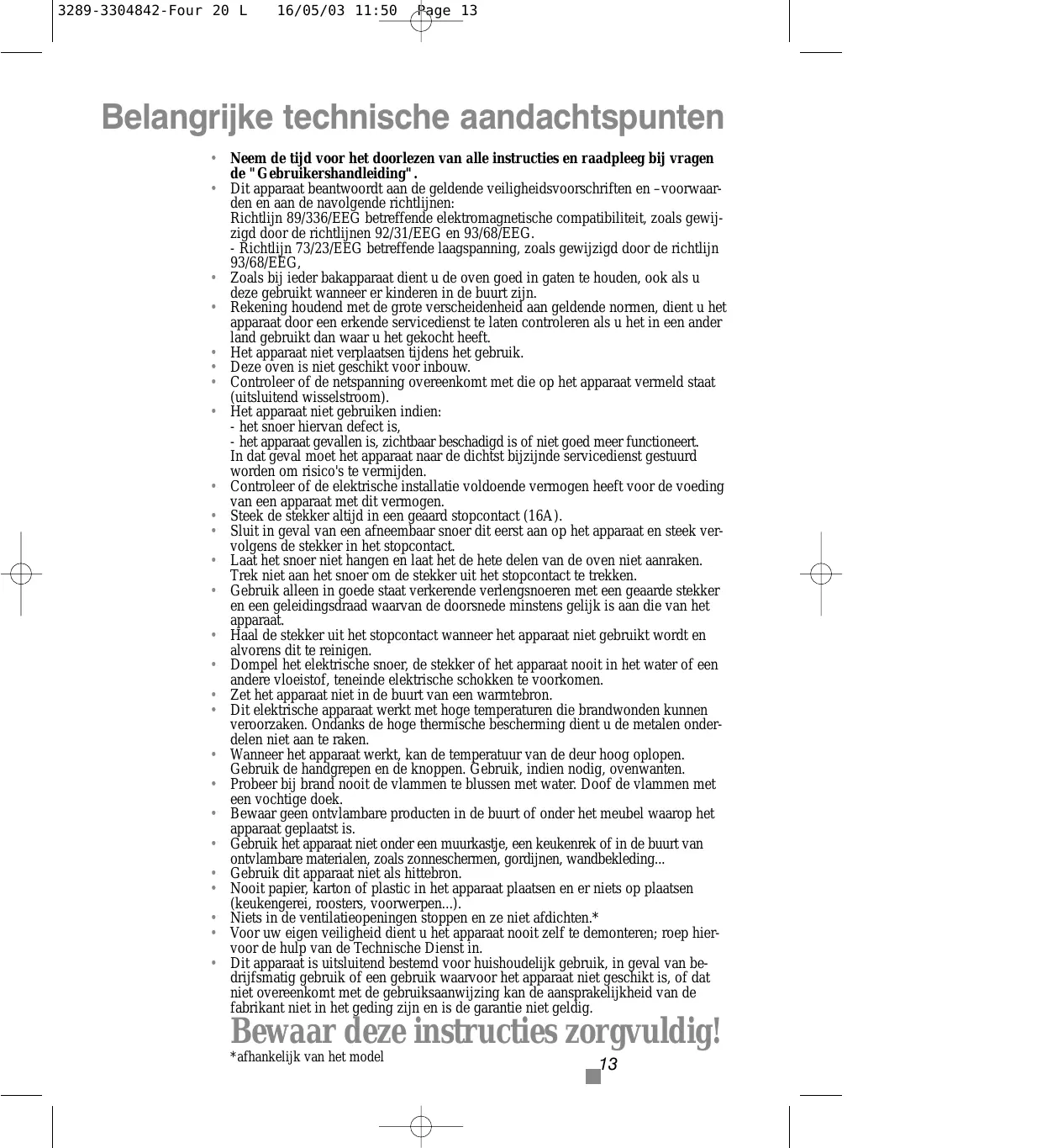 *selon modèles 3289-3304842-Four 20 L 16/05/03 11:50 Page 13 Belangrijke technische aandachtspunten