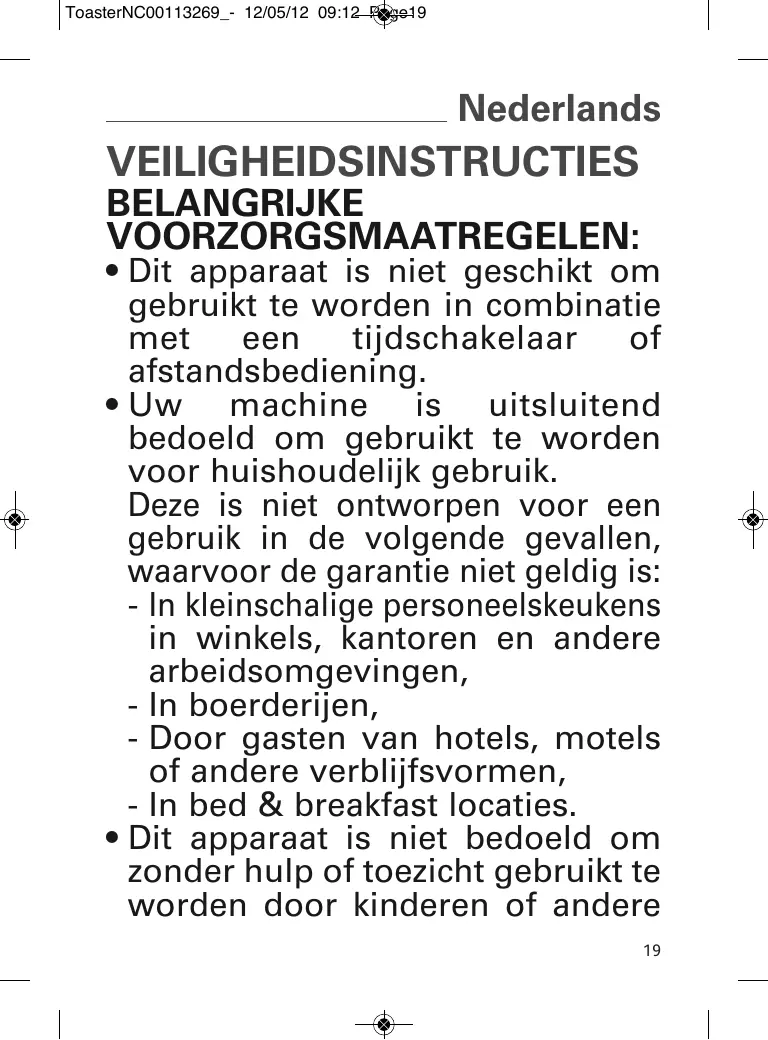 ToasterNC00113269_- 12/05/12 09:12 Page19 Nederlands VEILIGHEIDSINSTRUCTIES BELANGRIJKE VOORZORGSMAATREGELEN: