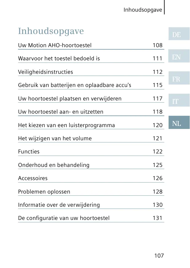 Veiligheidsinstructies In sommige landen gelden restricties voor het gebruik van draadloze apparatuur. Neem contact op met de plaatselijke overheid voor meer informatie. AANWIJZING Lekkende batterijen beschadigen de hoortoestellen. Wanneer u uw hoortoestellen niet gebruikt, zet ze dan uit om de batterij te sparen. Verwijder de batterijen wanneer u de hoortoestellen langere tijd niet gebruikt. AANWIJZING Batterijen bevatten stoffen die schadelijk zijn voor het milieu. Gooi lege batterijen niet met het huisvuil weg. Gooi batterijen weg zoals voorgeschreven door de overheid of lever ze in bij uw audicien.