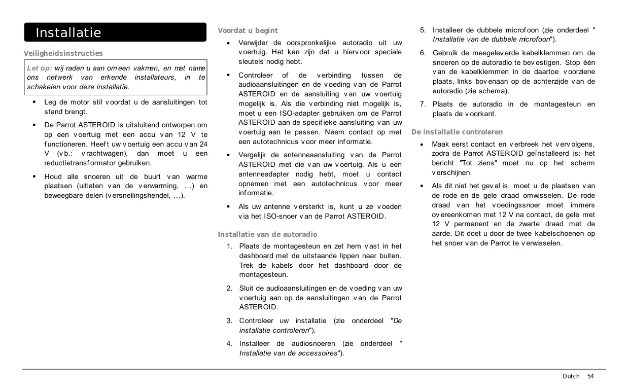 Installatie Veiligheidsinstructies Let op: wij raden u aan om een vakman, en met name ons netwerk van erkende installateurs, in te schakelen voor deze installatie. Leg de motor stil v oordat u de aansluitingen tot stand brengt. De Parrot ASTEROID is uitsluitend ontworpen om op een v oertuig met een accu v an 12 V te f unctioneren. Heef t uw v oertuig een accu v an 24 V (v b.: v rachtwagen), dan moet u een reductietransf ormator gebruiken. Houd alle snoeren uit de buurt v an warme plaatsen (uitlaten v an de v erwarming, ...) en beweegbare delen (v ersnellingshendel, ...). Voordat u begint Verwijder de oorspronkelijke autoradio uit uw v oertuig. Het kan zijn dat u hierv oor speciale sleutels nodig hebt. Controleer of de v erbinding tussen de audioaansluitingen en de v oeding v an de Parrot ASTEROID en de aansluiting v an uw v oertuig mogelijk is. Als die v erbinding niet mogelijk is, moet u een ISO-adapter gebruiken om de Parrot ASTEROID aan de specif ieke aansluiting v an uw v oertuig aan te passen. Neem contact op met een autotechnicus v oor meer inf ormatie. Vergelijk de antenneaansluiting v an de Parrot ASTEROID met die v an uw v oertuig. Als u een antenneadapter nodig hebt, moet u contact opnemen met een autotechnicus v oor meer inf ormatie. Als uw antenne v ersterkt is, kunt u ze v oeden v ia het ISO-snoer v an de Parrot ASTEROID. Installatie van de autoradio