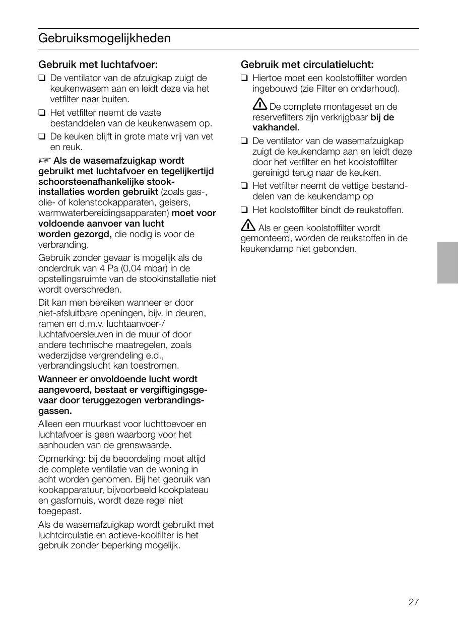 Inscrivez les numéros correspondants de votre hotte dans le cadre ci-dessus. Ces numéros se trouvent à l'intérieur de l'appareil, sur la plaque signalétique accessible une fois la grille de filtre retirée. 몇 Si des réclamations résultent de la conception et de la pose de la conduite, le fabricant de la hotte aspirante décline toute garantie. Gebruiksmogelijkheden Gebruik met luchtafvoer: Gebruik met circulatielucht: ❑ De ventilator van de afzuigkap zuigt de keukenwasem aan en leidt deze via het vetfilter naar buiten. ❑ Het vetfilter neemt de vaste bestanddelen van de keukenwasem op. ❑ De keuken blijft in grote mate vrij van vet en reuk. D Als de wasemafzuigkap wordt gebruikt met luchtafvoer en tegelijkertijd schoorsteenafhankelijke stookinstallaties worden gebruikt (zoals gas-, olie- of kolenstookapparaten, geisers, warmwaterbereidingsapparaten) moet voor voldoende aanvoer van lucht worden gezorgd, die nodig is voor de verbranding. Gebruik zonder gevaar is mogelijk als de onderdruk van 4 Pa (0,04 mbar) in de opstellingsruimte van de stookinstallatie niet wordt overschreden. Dit kan men bereiken wanneer er door niet-afsluitbare openingen, bijv. in deuren, ramen en d.m.v. luchtaanvoer-/ luchtafvoersleuven in de muur of door andere technische maatregelen, zoals wederzijdse vergrendeling e.d., verbrandingslucht kan toestromen. Wanneer er onvoldoende lucht wordt aangevoerd, bestaat er vergiftigingsgevaar door teruggezogen verbrandingsgassen. Alleen een muurkast voor luchttoevoer en luchtafvoer is geen waarborg voor het aanhouden van de grenswaarde. Opmerking: bij de beoordeling moet altijd de complete ventilatie van de woning in acht worden genomen. Bij het gebruik van kookapparatuur, bijvoorbeeld kookplateau en gasfornuis, wordt deze regel niet toegepast. Als de wasemafzuigkap wordt gebruikt met luchtcirculatie en actieve-koolfilter is het gebruik zonder beperking mogelijk. ❑ Hiertoe moet een koolstoffilter worden ingebouwd (zie Filter en onderhoud).