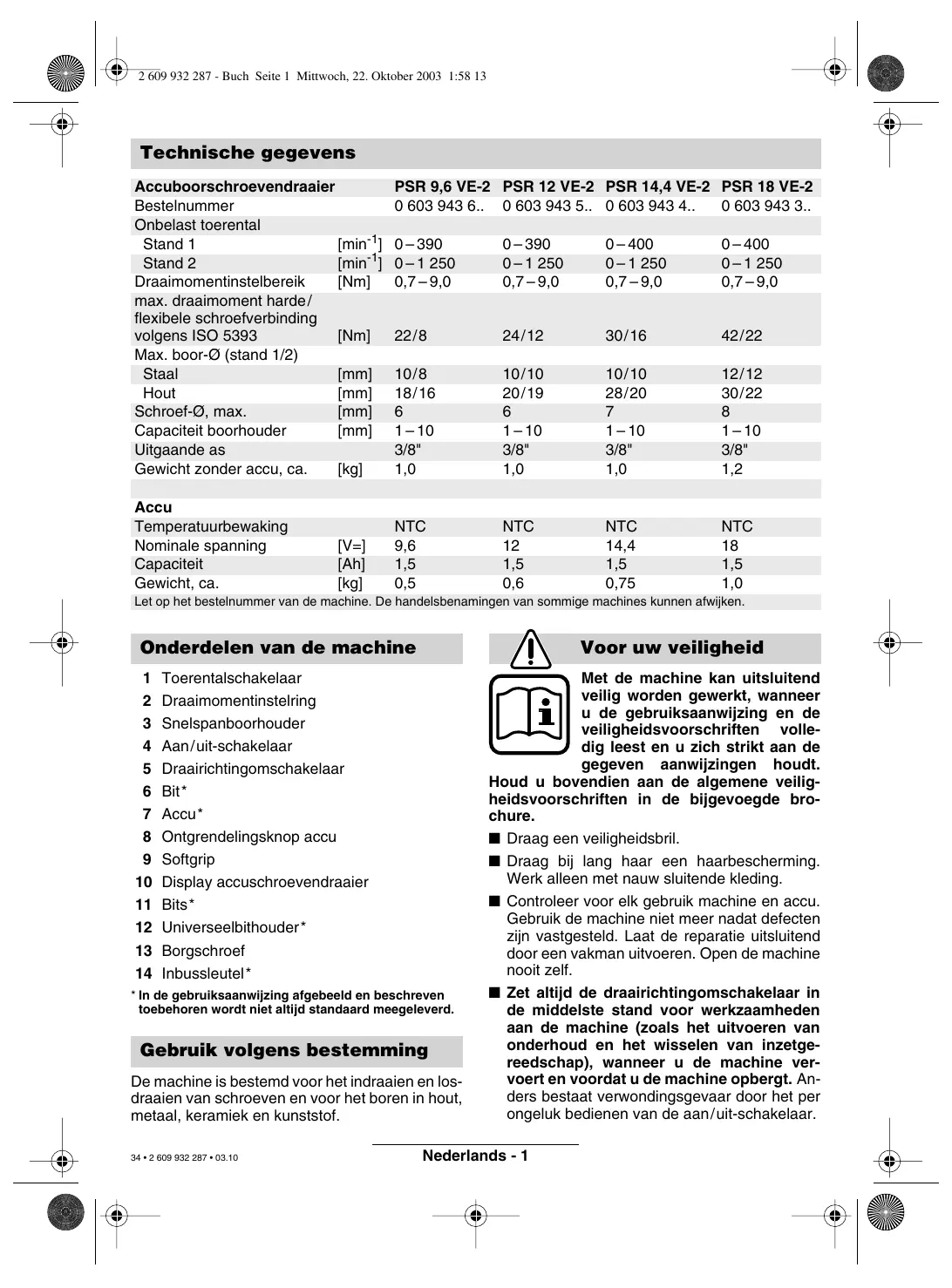 De functie van de waarschuwingen werkt ook in de standby-modus. ➊ De accu is bijna leeg: ➯ Laad de accu op. ➋ De motor is oververhit: ➯ Schakel het gereedschap uit of laat het enige tijd onbelast draaien om het te laten afkoelen. Wacht tot de indicatie uit gaat. Instellingshulp De indicatie dient ter oriëntatie. De waarden moeten proefsgewijs worden gecontroleerd. Materiaalkeuze (zie afbeelding F ) Kies het te bewerken materiaal door de linkerknop (meermaals) in te drukken: ➌ Staal ➍ Zachthout ➎ Hardhout Het voorbeeld geeft aan: hardhout. Keuze van de toepassing (zie afbeelding G ) Kies de toepassing door de rechterknop (meermaals) in te drukken: ➏ + ➑ Schroef indraaien (4 diameterbereiken) ➐ + ➑ Gat boren (2 diameterbereiken) Advies (zie afbeelding H ) De indicatie biedt een advies voor de optimale instelling van uw accuboorschroevendraaier. Stel de advieswaarden op uw boorschroevendraaier in. ➒ Stand 1/stand 2 ➓ Draaimomentbereik (stand 1 – 5, 5 – 15, 15 – 25, „Boren”) Het voorbeeld geeft aan: stand 2, draaimomentbereik 5 – 15. Nederlands - 3 2 609 932 287 - Buch Seite 4 Mittwoch, 22. Oktober 2003 1:58 13 Boorhouder vervangen Onderhoud en reiniging ■ Neem altijd voor werkzaamheden aan de machine de accu uit de machine. De borgschroef 13 voorkomt losdraaien van de boorhouder van de uitgaande as. Draai de boorhouder helemaal open en schroef de borgschroef 13 volledig naar buiten door deze met de wijzers van de klok mee te draaien (zie afbeelding B ). Boorhouder losdraaien (zie afbeelding C ) Leg de machine op een stabiele ondergrond (bijv. werkbank). Houd de machine vast en draai de boorhouder net als een schroef los door naar links te draaien (➊). Een vastzittende boorhouder kan worden losgemaakt door middel van een slag op de lange steel van de inbussleutel 14. ■ Neem altijd voor werkzaamheden aan de machine de accu uit de machine. ■ Houd de machine en de ventilatieopeningen altijd schoon om goed en veilig te werken. Mocht de machine ondanks zeer zorgvuldige fabricage- en testmethoden toch defect raken, dient de reparatie door een erkende reparatieservice voor Bosch elektrisch gereedschap te worden uitgevoerd. Vermeld bij vragen en bestellingen van vervangingsonderdelen altijd het bestelnummer van 10 cijfers van de machine. Milieubescherming Boorhouder vastdraaien (zie afbeelding D ) De montage van de boorhouder vindt plaats in omgekeerde volgorde (➋). Tips voor de werkzaamheden Softgrip Het stroeve vlak 9 aan de achterzijde voorkomt wegglijden en zorgt voor een betere grip en het gemakkelijker vasthouden van de machine. Door de rubberlaag wordt bovendien een trillingsdempend effect bereikt. Tips ■ Gebruik alleen bij de schroefkop passende bits. ■ Bij het indraaien van grotere of lange schroeven in harde materialen kunt u het best voorboren. ■ Gebruik bij het boren in metaal alleen perfect geslepen HSS-boren (HSS = snelsnijstaal van hoge kwaliteit). Met het Bosch-toebehorenprogramma bent u verzekerd van de juiste kwaliteit. 37 • 2 609 932 287 • 03.10 Terugwinnen van grondstoffen in plaats van het weggooien van afval Machine, toebehoren en verpakking moeten op een voor het milieu verantwoorde manier worden hergebruikt. Deze gebruiksaanwijzing is vervaardigd van chloorvrij gebleekt kringlooppapier. De kunststof delen zijn gekenmerkt om ze per soort te kunnen recyclen. Nikkelcadmiumaccu: Indien uw product is voorzien van een nikkelcadmiumaccu, moet de accu worden ingezameld en gerecycled of op milieuvriendelijke wijze worden afgevoerd. Defecte en lege accu’s moeten volgens richtlijn 91/157/EEG worden gerecycled. Nederlands - 4 2 609 932 287 - Buch Seite 5 Mittwoch, 22. Oktober 2003 1:58 13 Informatie over geluid en trillingen Technische dienst en klantenservice Meetwaarden vastgesteld volgens EN 50 260. Het A-gewaardeerde geluidsdrukniveau van de machine is kenmerkend lager dan 70 dB (A). Tijdens het werken kan het geluidsniveau 85 dB (A) overschrijden. Draag oorbeschermers. Kenmerkend is dat de trillingen van hand en arm geringer zijn dan 2,5 m/s2. Explosietekeningen en informatie over vervangingsonderdelen vindt u op: www.bosch-pt.com Nederland