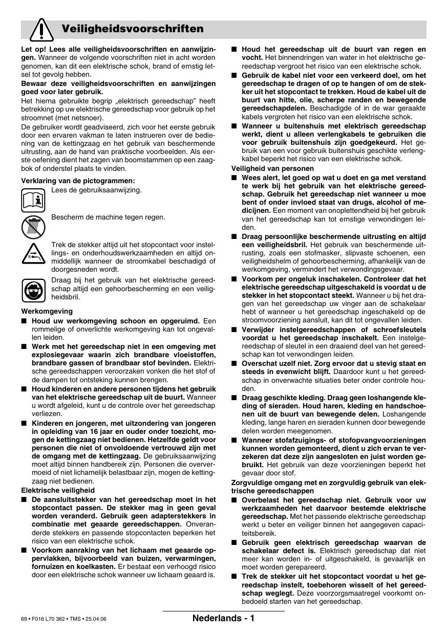Lors de l’utilisation de l’outil électroportatif, portez toujours une protection acoustique et des lunettes de protection. Endroit de travail ■ Maintenez l’endroit de travail propre et bien rangé. Un lieu de travail en désordre ou mal éclairé augmente le risque d’accidents. ■ N’utilisez pas l’appareil dans un environnement présentant des risques d’explosion et où se trouvent des liquides, des gaz ou poussières inflammables. Les outils électroportatifs génèrent des étincelles risquant d’enflammer les poussières ou les vapeurs. ■ Tenez les enfants et autres personnes éloignés durant l’utilisation de l’outil électroportatif. En cas d’inattention vous risquez de perdre le contrôle sur l’appareil. ■ Les enfants et les adolescents n’ont pas le droit d’utiliser la tronçonneuse ; sauf les apprentis à partir de 16 ans sous la surveillance d’un adulte. Ceci vaut également pour les personnes ne connaissant pas ou très peu le maniement de la tronçonneuse. Les instructions d’utilisation devraient toujours se trouver à portée de la main. Les personnes fatiguées ou fragiles physiquement, n’ont pas le droit d’utiliser la tronçonneuse. Sécurité relative au système électrique ■ La fiche de secteur de l’outil électroportatif doit être appropriée à la prise de courant. Ne pas modifier en aucun cas la fiche. Ne pas utiliser de fiches d’adaptateur avec des appareils avec mise à la terre. Les fiches non modifiées et les prises de courant appropriées réduisent le risque de choc électrique. ■ Eviter le contact physique avec des surfaces mises à la terre tels que tuyaux, radiateurs, fours et réfrigérateurs. Il y a un risque élevé de choc électrique au cas où votre corps serait relié à la terre. ■ Ne pas exposer l’outil électroportatif à la pluie ou à l’humidité. La pénétration d’eau dans un outil électroportatif augmente le risque d’un choc électrique. 26 • F016 L70 362 • TMS • 25.04.06