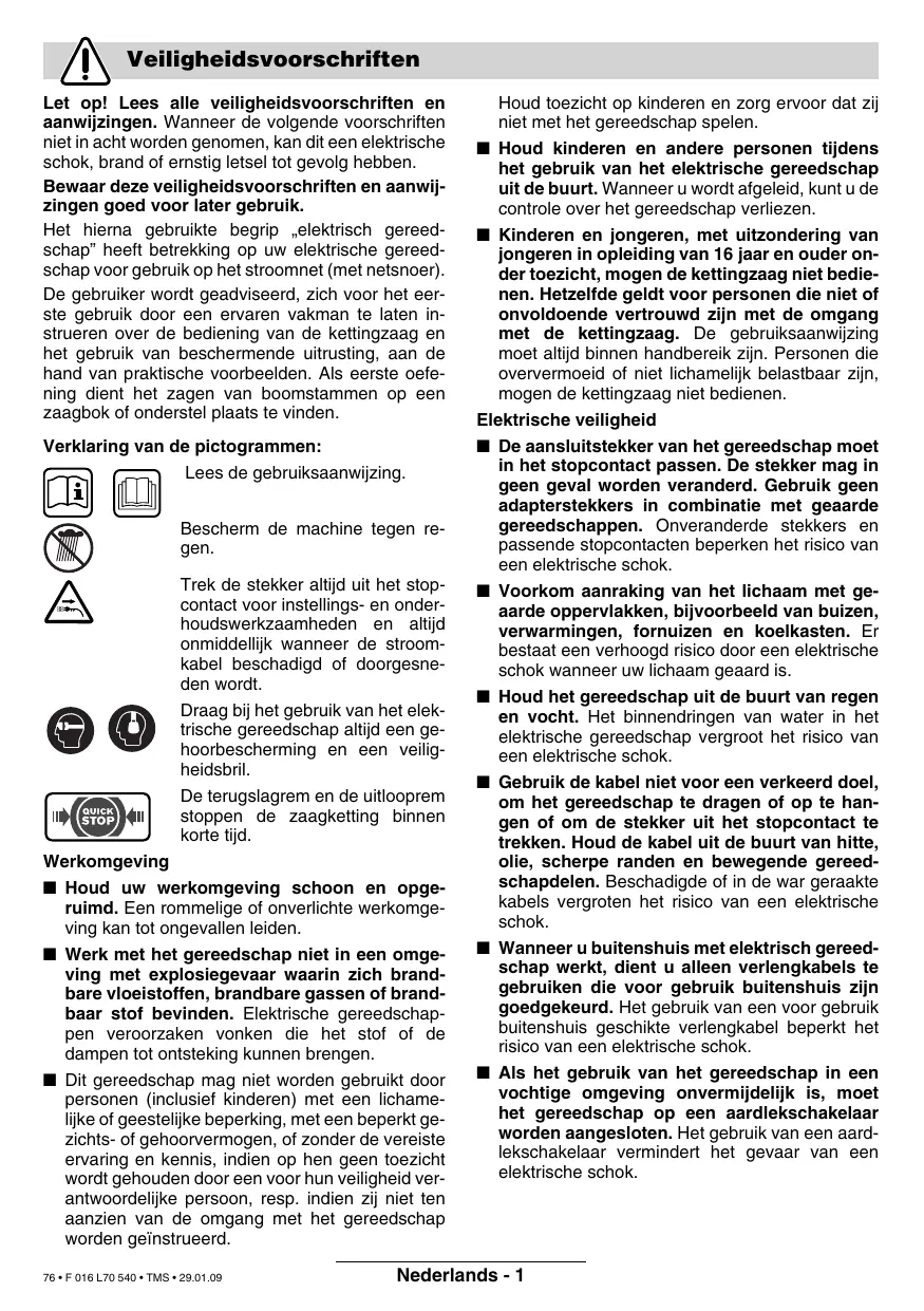 Trek de stekker altijd uit het stopcontact voor instellings- en onderhoudswerkzaamheden en altijd onmiddellijk wanneer de stroomkabel beschadigd of doorgesneden wordt.
