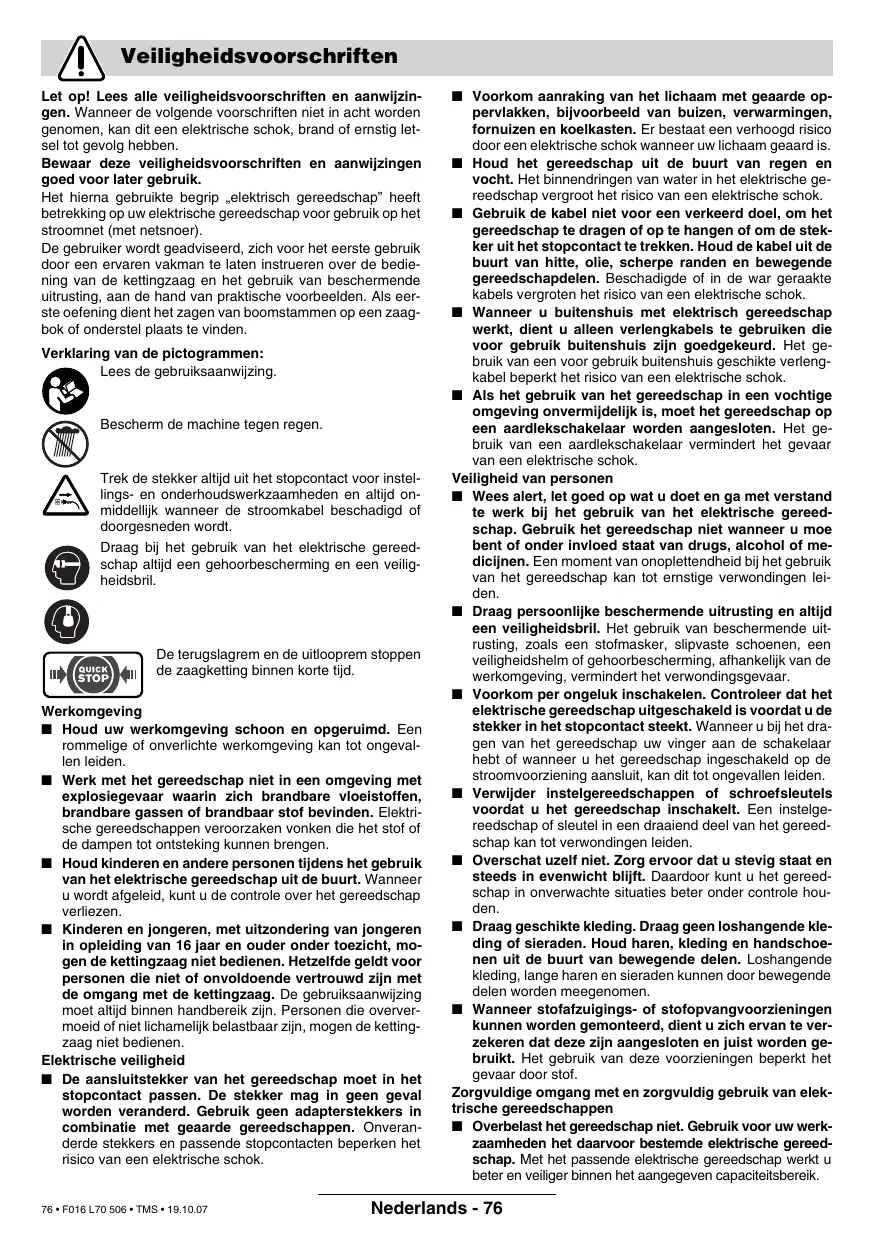 Prova di omologazione num. 210888100.01 CE attraverso stazione di collaudo notificata num. 0344. CE 2000/14: Il livello della potenza sonora L WA garantito è minore di 104 dB (A). Procedimento di valutazione della conformità secondo appendice V. Documentazione tecnica redatta da PT-LG/EAE – Stowmarket, Inghilterra. Als u de machine wilt uitschakelen, laat u de aan/ uit-schakelaar 2 los. Na het zagen mag de kettingzaag niet worden gestopt door het bedienen van de voorste handbescherming (activeren van de terugslagrem).