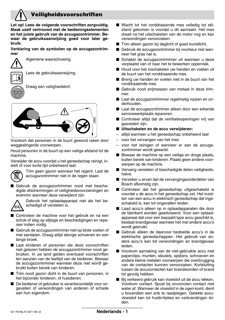............................................................... 0 44 / 8 47 15 13 Fax ............................................................... 0 44 / 8 47 15 53 41 • F016L70 457 • 06.12 Dr. Eckerhard Strötgen Head of Product Certification Italiano - 6 Veiligheidsvoorschriften Let op! Lees de volgende voorschriften zorgvuldig. Maak uzelf vertrouwd met de bedieningselementen en het juiste gebruik van de accugazontrimmer. Bewaar de gebruiksaanwijzing goed voor later gebruik. Verklaring van de symbolen op de accugazontrimmer Algemene waarschuwing. Lees de gebruiksaanwijzing. Draag een veiligheidsbril. 360° Voorkom dat personen in de buurt gewond raken door weggeslingerde voorwerpen. Houd personen in de buurt op een veilige afstand tot de machine. Verwijder de accu voordat u het gereedschap reinigt, instelt of voor korte tijd onbeheerd laat. Trim geen gazon wanneer het regent. Laat de accugazontrimmer niet in de regen staan. ■ Gebruik de accugazontrimmer nooit met beschadigde afschermingen of veiligheidsvoorzieningen en evenmin wanneer deze verwijderd zijn. Gebruik het oplaadapparaat niet als het beschadigd of versleten is. ■ Controleer de machine voor het gebruik en na een schok of slag op slijtage en beschadigingen en repareer indien nodig. ■ Gebruik de accugazontrimmer niet op blote voeten of met sandalen. Draag altijd stevige schoenen en een lange broek. ■ Laat kinderen of personen die deze voorschriften niet gelezen hebben de accugazontrimmer nooit gebruiken. In uw land gelden eventueel voorschriften ten aanzien van de leeftijd van de bediener. Bewaar de accugazontrimmer wanneer deze niet wordt gebruikt buiten bereik van kinderen. ■ Trim nooit gazon dicht in de buurt van personen, in het bijzonder kinderen, of huisdieren. ■ De bediener of gebruiker is verantwoordelijk voor ongevallen of verwondingen van anderen of schade aan hun eigendom. 42 • F016L70 457 • 06.12 ■ Wacht tot het ronddraaiende mes volledig tot stilstand gekomen is voordat u dit aanraakt. Het mes draait na het uitschakelen van de motor nog en kan verwondingen veroorzaken. ■ Trim alleen gazon bij daglicht of goed kunstlicht. ■ Gebruik de accugazontrimmer bij voorkeur niet wanneer het gras nat is. ■ Schakel de accugazontrimmer uit wanneer u deze verplaatst van of naar het te bewerken oppervlak. ■ Houd voor het inschakelen uw handen en voeten uit de buurt van het ronddraaiende mes. ■ Breng uw handen en voeten niet in de buurt van het ronddraaiende mes. ■ Gebruik nooit snijmessen van metaal in deze trimmer. ■ Laat de accugazontrimmer regelmatig nazien en onderhouden. ■ Laat de accugazontrimmer alleen door een erkende servicewerkplaats repareren. ■ Controleer altijd dat de ventilatieopeningen vrij van gasresten zijn. ■ Uitschakelen en de accu verwijderen: – altijd wanneer u het gereedschap onbeheerd laat – voor het vervangen van het mes – voor het reinigen of wanneer er aan de accugazontrimmer wordt gewerkt. ■ Bewaar de machine op een veilige en droge plaats, buiten bereik van kinderen. Plaats geen andere voorwerpen op de machine. ■ Vervang versleten of beschadigde delen veiligheidshalve. ■ Verzeker u ervan dat de vervangingsonderdelen van Bosch afkomstig zijn. ■ Controleer dat het gereedschap uitgeschakeld is voordat u de accu in het gereedschap zet. Het inzetten van een accu in elektrisch gereedschap dat ingeschakeld is, kan tot ongevallen leiden. ■ Laad accu’s alleen op in oplaadapparaten die door de fabrikant worden geadviseerd. Voor een oplaadapparaat dat voor een bepaald type accu geschikt is, bestaat brandgevaar wanneer het met andere accu’s wordt gebruikt. ■ Gebruik alleen de daarvoor bedoelde accu’s in de elektrische gereedschappen. Het gebruik van andere accu’s kan tot verwondingen en brandgevaar leiden. ■ Voorkom aanraking van de niet-gebruikte accu met paperclips, munten, sleutels, spijkers, schroeven en andere kleine metalen voorwerpen die overbrugging van de contacten kunnen veroorzaken. Kortsluiting tussen de accucontacten kan brandwonden of brand tot gevolg hebben. ■ Bij verkeerd gebruik kan vloeistof uit de accu lekken. Voorkom contact. Spoel bij onvoorzien contact met water af. Wanneer de vloeistof in de ogen komt, dient u bovendien een arts te raadplegen. Gelekte accuvloeistof kan tot huidirritaties en verbrandingen leiden. Nederlands - 1 Technische gegevens Accugazontrimmer