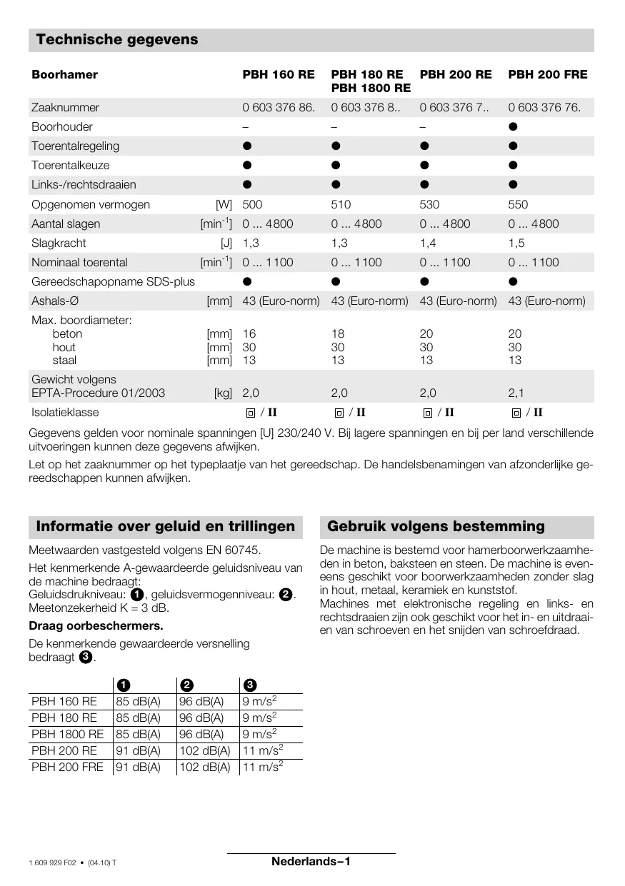 Stofbeschermingskap vervangen Vervang een beschadigde stofbeschermingskap op tijd, aangezien het stof dat in de gereedschapopname binnendringt tot functiestoringen leidt. Geadviseerd wordt, deze vervanging door de klantenservice te laten uitvoeren. Technische dienst en klantenservice Explosietekeningen en informatie over vervangingsonderdelen vindt u op: www.bosch-pt.com. Nederland ✆ . . . . . . . . . . . . . . . . . . . . . . +31 (0)23/56 56 613 Fax . . . . . . . . . . . . . . . . . . . . . +31 (0)23/56 56 621 E-mail: Gereedschappen@nl.bosch.com België ✆ . . . . . . . . . . . . . . . . . . . . . . . +32 (0)2/525 51 43 Fax . . . . . . . . . . . . . . . . . . . . . . +32 (0)2/525 54 20 E-mail: Outillage.Gereedschappen@be.bosch.com Mocht de machine ondanks zeer zorgvuldige fabricage- en testmethoden toch defect raken, dient de reparatie door een erkende servicewerkplaats voor Bosch elektrisch gereedschap te worden uitgevoerd. Vermeld bij vragen en bestellingen van vervangingsonderdelen altijd het uit tien cijfers bestaande zaaknummer overeenkomstig het typeplaatje van de machine. Milieubescherming Conformiteitsverklaring Wij verklaren op eigen verantwoording dat dit product voldoet aan de volgende normen en normatieve documenten: EN 60745 volgens de bepalingen van de richtlijnen 89/336/EEG en 98/37/EG. Terugwinnen van grondstoffen in plaats van het weggooien van afval Machine, toebehoren en verpakking dienen op een voor het milieu verantwoorde manier te worden hergebruikt. Deze gebruiksaanwijzing is vervaardigd van chloorvrij gebleekt kringlooppapier. De kunststof delen zijn gekenmerkt om ze per soort te kunnen recyclen. 1 609 929 F02 • (04.10) T Dr. Egbert Schneider Senior Vice President Engineering Dr. Eckerhard Strötgen Head of Product Certification Robert Bosch GmbH, Geschäftsbereich Elektrowerkzeuge Wijzigingen voorbehouden Nederlands–5 Tekniske data Borehammer PBH 160 RE