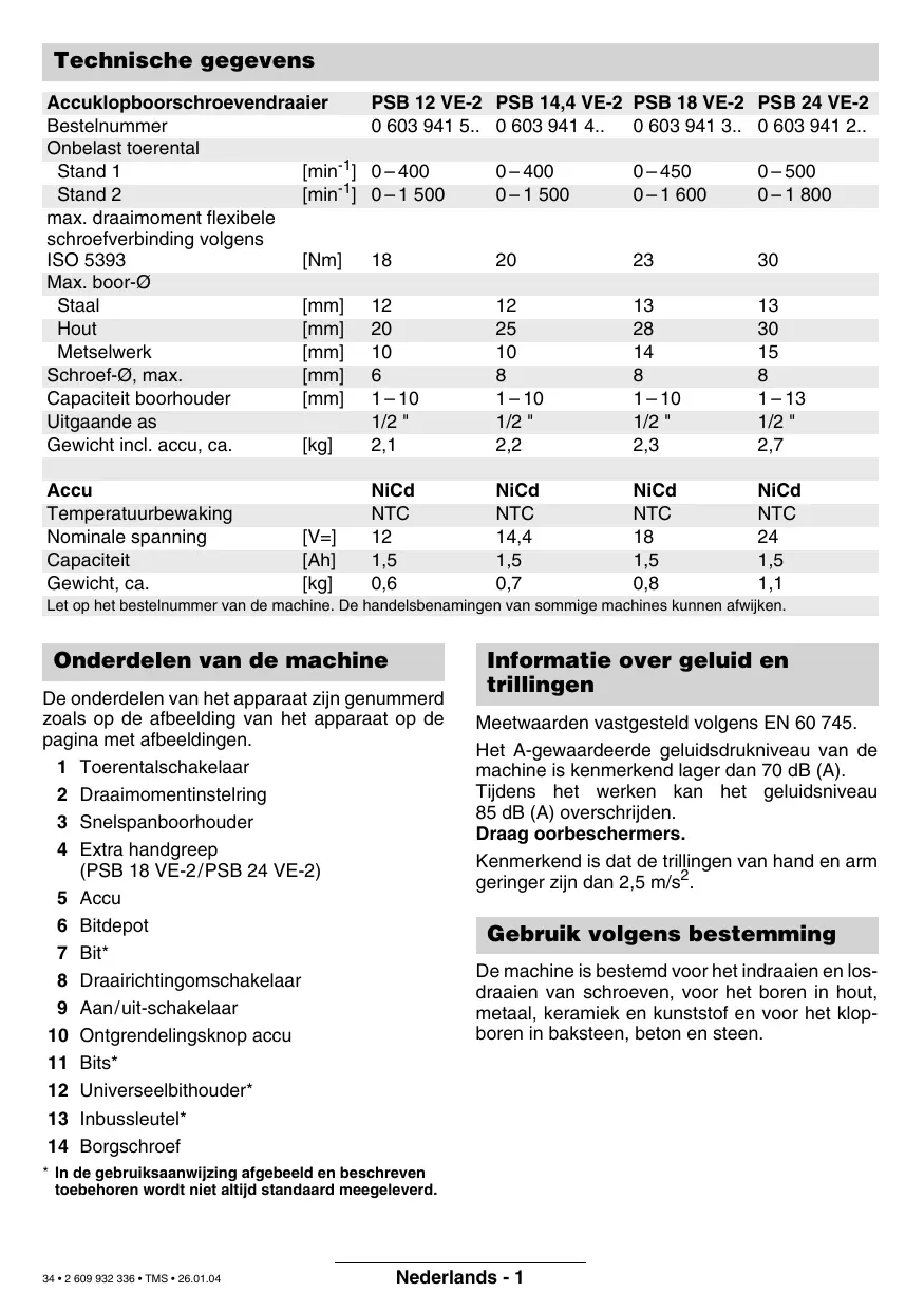 1 – 13 1/2 " 2,7 NiCd NTC 1,5 0,6 NiCd NTC 14,4 1,5 0,7 NiCd NTC 1,5 0,8 NiCd NTC 1,5 1,1 Let op het bestelnummer van de machine. De handelsbenamingen van sommige machines kunnen afwijken. Onderdelen van de machine De onderdelen van het apparaat zijn genummerd zoals op de afbeelding van het apparaat op de pagina met afbeeldingen. 1 Toerentalschakelaar 2 Draaimomentinstelring 3 Snelspanboorhouder 4 Extra handgreep (PSB 18 VE-2/PSB 24 VE-2) 5 Accu 6 Bitdepot 7 Bit* 8 Draairichtingomschakelaar 9 Aan/uit-schakelaar 10 Ontgrendelingsknop accu 11 Bits* 12 Universeelbithouder* 13 Inbussleutel* 14 Borgschroef Informatie over geluid en trillingen Meetwaarden vastgesteld volgens EN 60 745. Het A-gewaardeerde geluidsdrukniveau van de machine is kenmerkend lager dan 70 dB (A). Tijdens het werken kan het geluidsniveau 85 dB (A) overschrijden. Draag oorbeschermers. Kenmerkend is dat de trillingen van hand en arm geringer zijn dan 2,5 m/s2. Gebruik volgens bestemming De machine is bestemd voor het indraaien en losdraaien van schroeven, voor het boren in hout, metaal, keramiek en kunststof en voor het klopboren in baksteen, beton en steen.