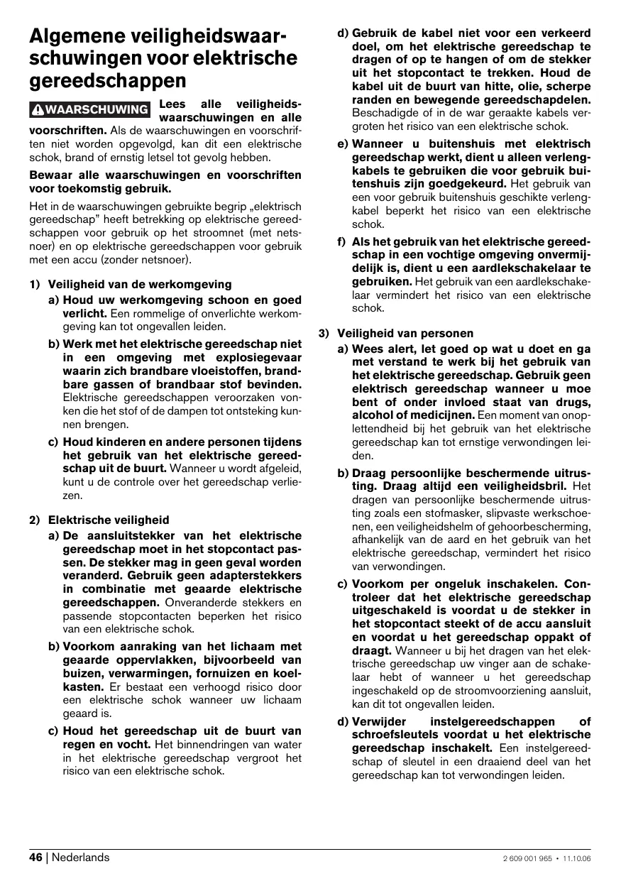 gebruik van elektrische gereedschappen a) Overbelast het gereedschap niet. Gebruik voor uw werkzaamheden het daarvoor bestemde elektrische gereedschap. Met het passende elektrische gereedschap werkt u beter en veiliger binnen het aangegeven capaciteitsbereik. b) Gebruik geen elektrisch gereedschap waarvan de schakelaar defect is. Elektrisch gereedschap dat niet meer kan worden in- of uitgeschakeld, is gevaarlijk en moet worden gerepareerd. c) Trek de stekker uit het stopcontact of neem de accu uit het elektrische gereedschap voordat u het gereedschap instelt, toebehoren wisselt of het gereedschap weglegt. Deze voorzorgsmaatregel voorkomt onbedoeld starten van het elektrische gereedschap. d) Bewaar niet-gebruikte elektrische gereedschappen buiten bereik van kinderen. Laat het gereedschap niet gebruiken door personen die er niet mee vertrouwd zijn en deze aanwijzingen niet hebben gelezen. Elektrische gereedschappen zijn gevaarlijk wanneer deze door onervaren personen worden gebruikt. e) Verzorg het elektrische gereedschap zorgvuldig. Controleer of bewegende delen van het gereedschap correct functioneren en niet vastklemmen en of onderdelen zodanig gebroken of beschadigd zijn dat de werking van het elektrische gereedschap nadelig wordt beïnvloed. Laat deze beschadigde onderdelen voor het gebruik repareren. Veel ongevallen hebben hun oorzaak in slecht onderhouden elektrische gereedschappen. 2 609 001 965 • 11.10.06