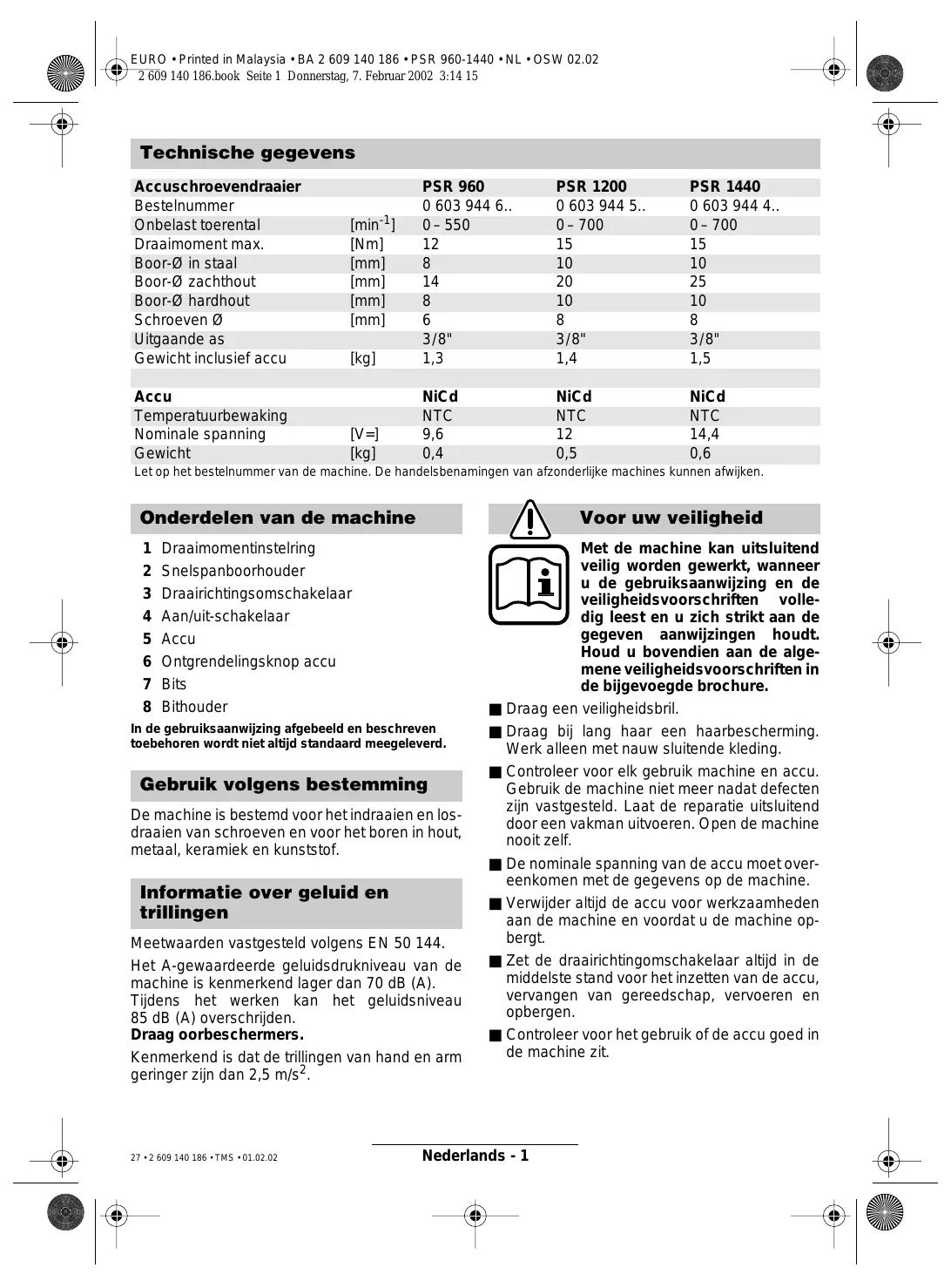 Nederlands - 3 EURO • Printed in Malaysia • BA 2 609 140 186 • PSR 960-1440 • NL • OSW 02.02 2 609 140 186.book Seite 4 Donnerstag, 7. Februar 2002 3:14 15 Milieubescherming Technische dienst en klantenservice Terugwinnen van grondstoffen in plaats van het weggooien van afval. Machine, toebehoren en verpakking moeten op een voor het milieu verantwoorde manier worden hergebruikt. Deze gebruiksaanwijzing is vervaardigd van chloorvrij gebleekt kringlooppapier. De kunststof delen zijn gekenmerkt om ze per soort te kunnen recyclen. Nikkelcadmiumaccu: indien uw product is voorzien van een nikkelcadmiumaccu, moet de accu worden ingezameld en gerecycled of op milieuvriendelijke wijze worden afgevoerd. Defecte en lege accu’s moeten volgens richtlijn 91/157/EEG worden gerecycled. www.bosch-pt.com Nederland Robert Bosch B.V. Postbus 502 NL-2132 AM Hoofddorp Neptunusstraat 71 NL-2132 JP Hoofddorp ✆ .................................................. +31 (0)23 / 56 56 620 Fax .................................................. +31 (0)23 / 56 56 611 E-Mail: Gereedschappen@nl.bosch.com België Robert Bosch N.V. After Sales Service Gereedschappen Henri Genessestraat 1 BE-1070 Brussel ✆ ..................................................... +32 (0)2 / 525.50 29 Fax ..................................................... +32 (0)2 / 525.54.30 ✆ Service conseil client ..... +32 (0)2 / 525.53.07 E-Mail: Outillage.Gereedschappen@be.bosch.com Conformiteitsverklaring Wij verklaren als alleen verantwoordelijke dat dit product voldoet aan de volgende normen en normatieve documenten: EN 50 144 (accugereedschappen) resp. EN 60 335 (accu-oplaadapparaten) volgens de bepalingen van de richtlijnen 73/23/EEG, 89/336/EEG en 98/37/EG. Dr. Gerhard Felten Dr. Eckerhard Strötgen Robert Bosch GmbH, Geschäftsbereich Elektrowerkzeuge Wijzigingen voorbehouden 30 • 2 609 140 186 • TMS • 01.02.02 Nederlands - 4 EURO • Printed in Malaysia • BA 2 609 140 186 • PSR 960-1440 • DK • OSW 02.02 2 609 140 186.book Seite 1 Donnerstag, 7. Februar 2002 3:14 15 Tekniske data Akku-skruetrækker Bestillingsnummer Omdrejningstal, ubelastet Drejningsmoment maks. Bore-Ø - stål Bore-Ø blødt træ Bore-Ø hårdt træ Skrue-Ø Borespindelgevind Vægt med akku Akku Temperaturovervågning Nominel spænding Vægt [kg] PSR 960 0 – 550