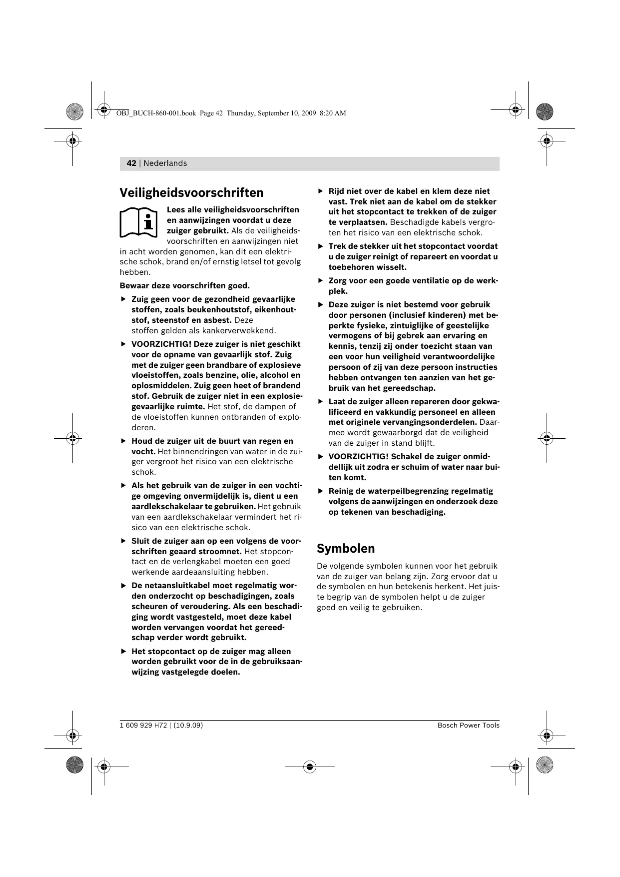 - Niet elk afgebeeld en beschreven toebehoren wordt standaard meegeleverd. Het volledige toebehoren vindt u in ons toebehorenprogramma. Informatie over geluid en trillingen Meetwaarden bepaald volgens EN 60704. Het A-gewogen geluidsdrukniveau van de zuiger bedraagt kenmerkend 77 dB(A). Onzekerheid K=3 dB. Conformiteitsverklaring Gebruik volgens bestemming Het apparaat is bestemd voor het zuigen van voor de gezondheid ongevaarlijke stoffen en niet-brandbare vloeistoffen. BIA stofklasse M. Gebruik de zuiger alleen wanneer u alle functies volledig kunt inschatten en zonder beperkingen kunt gebruiken of daarvoor bestemde instructies heeft ontvangen. Afgebeelde componenten Wij verklaren als alleen verantwoordelijke dat het onder „Technische gegevens” beschreven product voldoet aan de volgende normen en normatieve documenten: EN 60335 volgens de bepalingen van de richtlijnen 2006/95/EG en 2004/108/EG. Dr. Egbert Schneider Senior Vice President Engineering Dr. Eckerhard Strötgen Head of Product Certification De componenten zijn genummerd zoals op de afbeelding van de zuiger op de pagina met afbeeldingen. 1 Kabelhouder 2 Draaggreep Robert Bosch GmbH, Power Tools Division D-70745 Leinfelden-Echterdingen