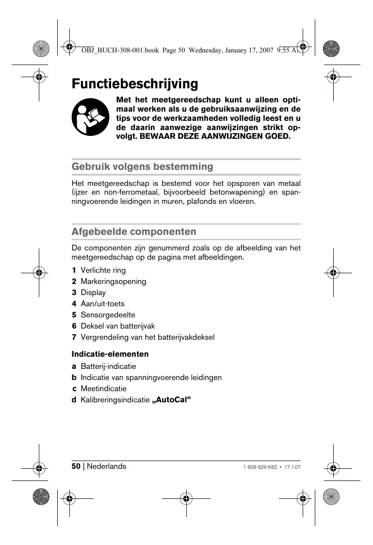- Afhankelijk van het materiaal en de grootte van de voorwerpen en van het materiaal en de toestand van de ondergrond ** Kleinere detectiediepte bij niet-spanningvoerende leidingen Let op het zaaknummer op het typeplaatje van het meetgereedschap. De handelsbenamingen van afzonderlijke meetgereedschappen kunnen afwijken. Montage Batterijen inzetten of vervangen Gebruik uitsluitend alkalimangaanbatterijen of oplaadbare batterijen. Als u het batterijvakdeksel 6 wilt openen, drukt u op de vergrendeling 7 in de richting van de pijl en klapt u het batterijvakdeksel omlaag. Plaats de meegeleverde batterij. Let daarbij op de juiste poolaansluitingen. 1 609 929 K82 • 17.1.07 Nederlands | 51 OBJ_BUCH-308-001.book Page 52 Wednesday, January 17, 2007 9:55 AM Als de batterij-indicatie a in het display brandt, kunt u bij gebruik van alkalimangaanbatterijen nog ongeveer 1 uur meten (bij oplaadbare batterijen is de gebruiksduur korter). Als de indicatie a knippert, kunt u nog ongeveer 10 minuten meten. Als de batterij-indicatie a en de verlichte ring 1 knipperen (rood), is er geen meting meer mogelijk en moet u de batterij of de oplaadbare batterij vervangen. f Neem de batterij uit het meetgereedschap als u het gedurende lange tijd niet gebruikt. De batterij kan, als deze lang wordt bewaard, roesten of zijn lading verliezen. Gebruik Ingebruikneming f Bescherm het meetgereedschap tegen vocht en fel zonlicht. In- en uitschakelen f Controleer voor het inschakelen van het meetgereedschap dat het sensorgedeelte 5 niet vochtig is. Wrijf het meetgereedschap indien nodig droog met een doek. f Als het meetgereedschap is blootgesteld aan een sterke temperatuurwisseling, laat u het voor het inschakelen op de juiste temperatuur komen. Als u het meetgereedschap wilt inschakelen, drukt u op de aan/uittoets 4. Na een korte zelftest is het meetgereedschap gereed voor gebruik. Een vinkje achter de kalibratie-indicatie „AutoCal” d geeft aan dat het meetgereedschap gereed voor gebruik is. Als u het meetgereedschap wilt uitschakelen, drukt u op de aan/ uit-toets 4. Als er ca. 10 minuten geen meting heeft plaatsgevonden, wordt het meetgereedschap automatisch uitgeschakeld om de batterijen te sparen. 52 | Nederlands 1 609 929 K82 • 17.1.07 OBJ_BUCH-308-001.book Page 53 Wednesday, January 17, 2007 9:55 AM Functies Het meetgereedschap detecteert voorwerpen onder het sensorbereik 5. Metalen voorwerpen opsporen Na het inschakelen is de ring 1 groen verlicht. Plaats het meetgereedschap op het te onderzoeken oppervlak en beweeg het zijwaarts. Als de ring 1 nog steeds verlicht is en er geen geluidssignaal klinkt, wordt er in de ondergrond geen metalen object herkend. Als het meetgereedschap een metalen voorwerp nadert, neemt de uitslag in de meetindicatie c toe. Boven een metalen voorwerp wordt de ring 1 rood verlicht en klinkt een geluidssignaal. Als u het meetgereedschap voor het eerst over het metalen object beweegt, wordt de positie grof aangegeven. Als u het meetgereedschap meermaals over metalen voorwerp beweegt, wordt het voorwerp steeds nauwkeuriger herkend. Nadat u het meetgereedschap (zonder het van de ondergrond op te tillen) meermaals over het metalen voorwerp heeft bewogen, kan de positie nauwkeurig worden aangegeven: Als de ring 1 rood verlicht is en het geluidssignaal klinkt, ligt het metalen voorwerp onder het midden van de sensor (onder de markeringsopening 2). Spanningvoerende leidingen opsporen Het meetgereedschap geeft leidingen aan waarop een spanning tussen 110 en 400 V staat en waarvan de frequentie overeenkomt met de wijdverspreide standaard (wisselstroom met 50 resp. 60 Hz). Andere leidingen (gelijkstroom, hogere of lagere frequentie of spanning) en leidingen waarop geen spanning staat, kunnen niet betrouwbaar worden gedetecteerd. Ze worden echter soms als metalen voorwerpen aangegeven. 1 609 929 K82 • 17.1.07 Nederlands | 53 OBJ_BUCH-308-001.book Page 54 Wednesday, January 17, 2007 9:55 AM Er wordt bij elke meting automatisch naar spanningvoerende leidingen gezocht. Als er een spanningvoerende leiding wordt gevonden, wordt in het display de indicatie b weergegeven. Beweeg het meetgereedschap meermaals over het oppervlak om de spanningvoerende leiding nauwkeuriger te lokaliseren. Nadat het meetgereedschap meermaals over hetzelfde gedeelte is bewogen, kan de positie van de spanningvoerende leiding zeer nauwkeurig worden aangegeven. Als het meetgereedschap zich zeer dicht bij de leiding bevindt, knippert de verlichte ring 1 rood en klinkt er een geluidssignaal met kort opeenvolgende tonen. Spanningvoerende leidingen kunnen gemakkelijker worden opgespoord als stroomverbruikers (zoals lampen en apparaten) worden aangesloten op de op te sporen leiding en deze verbruikers worden ingeschakeld. Leidingen met 110 V, 230 V en 400 V (draaistroom) worden met ongeveer evenveel resultaat gevonden. Onder bepaalde omstandigheden (bijvoorbeeld achter metalen oppervlakken of achter oppervlakken met een hoog watergehalte) kunnen spanningvoerende leidingen niet altijd worden gevonden. Als er in een vrij groot gedeelte overal een meetwaarde c wordt weergegeven, schermt het materiaal elektrisch af en kunnen spanningvoerende leidingen niet op een betrouwbare wijze worden opgespoord. Tips voor de werkzaamheden f De meetresultaten kunnen afhankelijk van het principe door bepaalde omgevingsomstandigheden nadelig worden beïnvloed. Daartoe behoren bijvoorbeeld de nabijheid van apparaten die sterke magnetische of elektromagnetische velden opwekken, vocht, metaalhoudende bouwmaterialen, met aluminium beklede isolatiematerialen of geleidend behang. Raadpleeg daarom voor het boren, zagen of frezen in muren, plafonds of vloeren ook andere informatiebronnen (bijvoorbeeld bouwtekeningen). Voorwerpen markeren U kunt gevonden voorwerpen indien nodig markeren. Bij maximale uitslag van de meetindicatie c bevindt het midden van het voorwerp zich onder de markeringsopening 2. De grenzen van het voorwerp kunt u vinden door het wisselen v