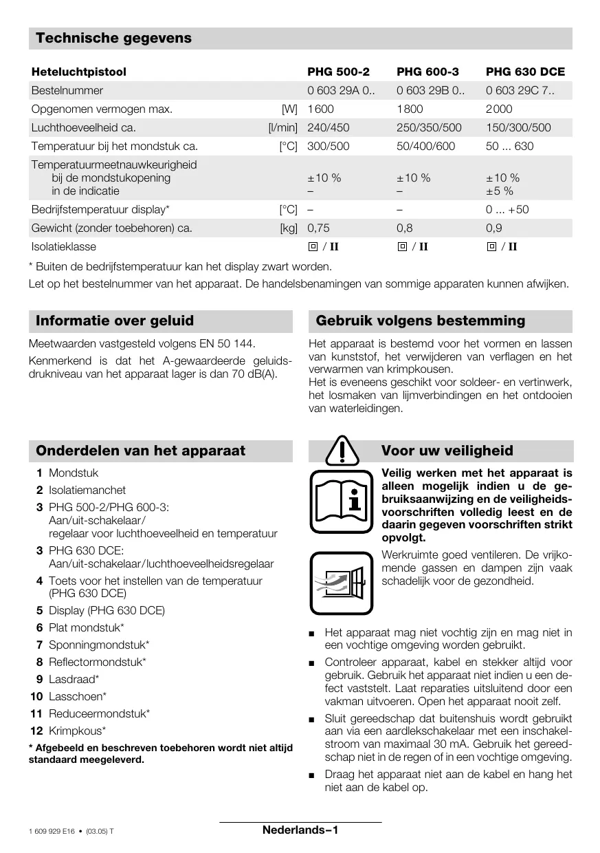 - Buiten de bedrijfstemperatuur kan het display zwart worden. Let op het bestelnummer van het apparaat. De handelsbenamingen van sommige apparaten kunnen afwijken. Informatie over geluid Gebruik volgens bestemming Meetwaarden vastgesteld volgens EN 50 144. Kenmerkend is dat het A-gewaardeerde geluidsdrukniveau van het apparaat lager is dan 70 dB(A). Het apparaat is bestemd voor het vormen en lassen van kunststof, het verwijderen van verflagen en het verwarmen van krimpkousen. Het is eveneens geschikt voor soldeer- en vertinwerk, het losmaken van lijmverbindingen en het ontdooien van waterleidingen. Onderdelen van het apparaat Voor uw veiligheid 1 Mondstuk 2 Isolatiemanchet 3 PHG 500-2/PHG 600-3: Aan/uit-schakelaar/ regelaar voor luchthoeveelheid en temperatuur 3 PHG 630 DCE: Aan/uit-schakelaar/luchthoeveelheidsregelaar 4 Toets voor het instellen van de temperatuur (PHG 630 DCE) 5 Display (PHG 630 DCE) 6 Plat mondstuk* 7 Sponningmondstuk* 8 Reflectormondstuk* 9 Lasdraad* 10 Lasschoen* 11 Reduceermondstuk* 12 Krimpkous* Veilig werken met het apparaat is alleen mogelijk indien u de gebruiksaanwijzing en de veiligheidsvoorschriften volledig leest en de daarin gegeven voorschriften strikt opvolgt. Werkruimte goed ventileren. De vrijkomende gassen en dampen zijn vaak schadelijk voor de gezondheid.