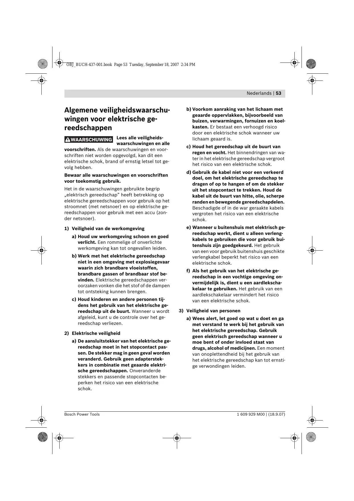 Het in de waarschuwingen gebruekte begrip „elektrisch gereedschap" heeft betrekking op elektrische gereedschappen voor gebruik op het stroomnet (met netsnoer) en op elektrische gereedschappen voor gebruik met een accu (zonder netsnoer).