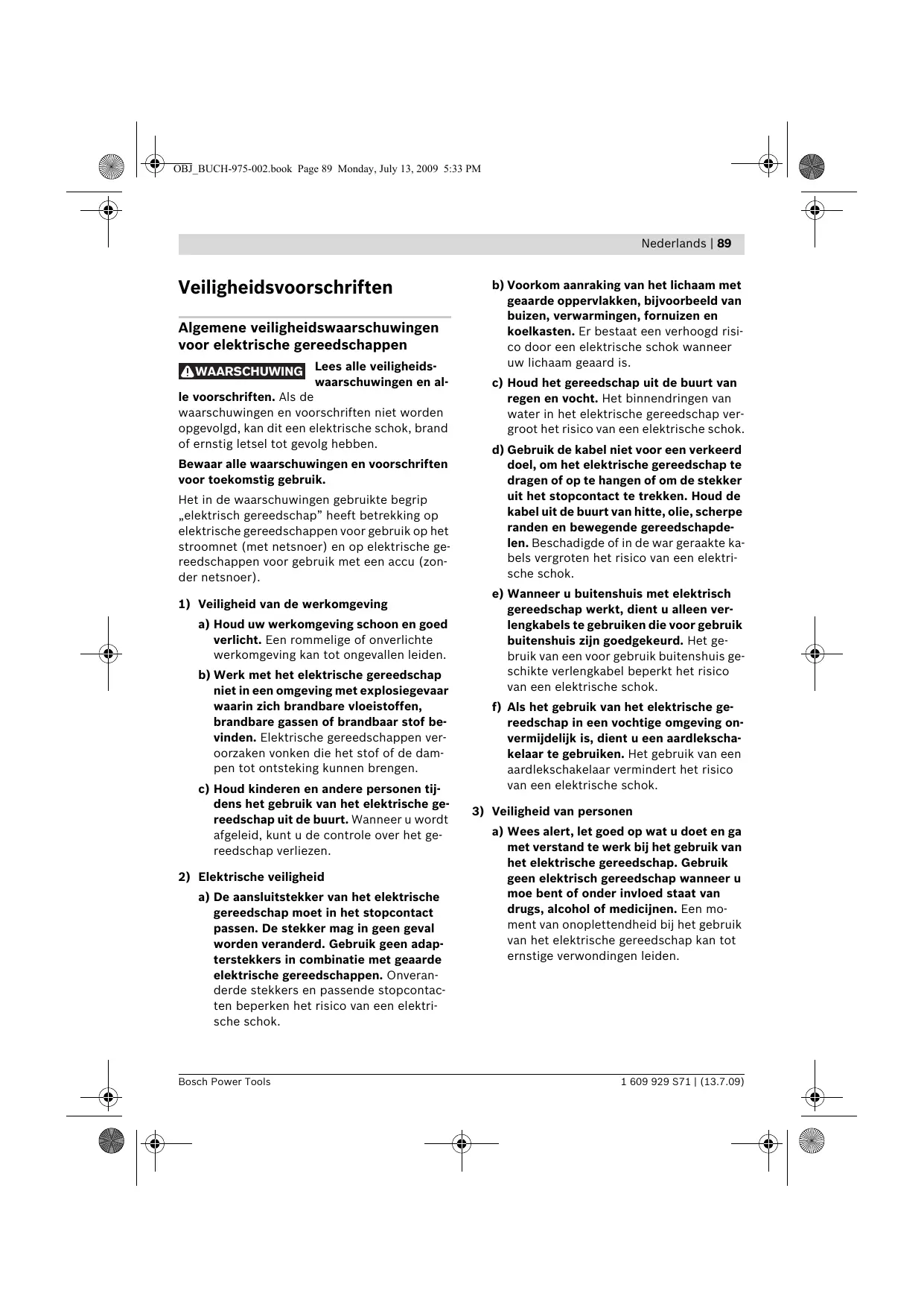 a) Wees alert, let goed op wat u doet en ga met verstand te werk bij het gebruik van het elektrische gereedschap. Gebruik geen elektrisch gereedschap wanneer u moe bent of onder invloed staat van drugs, alcohol of medicijnen. Een moment van onoplettendheid bij het gebruik van het elektrische gereedschap kan tot ernstige verwondingen leiden. 1 609 929 S71 | (13.7.09) OBJ_BUCH-975-002.book Page 90 Monday, July 13, 2009 5:33 PM 90 | Nederlands b) Draag persoonlijke beschermende uitrusting. Draag altijd een veiligheidsbril. Het dragen van persoonlijke beschermende uitrusting zoals een stofmasker, slipvaste werkschoenen, een veiligheidshelm of gehoorbescherming, afhankelijk van de aard en het gebruik van het elektrische gereedschap, vermindert het risico van verwondingen. c) Voorkom per ongeluk inschakelen. Controleer dat het elektrische gereedschap uitgeschakeld is voordat u de stekker in het stopcontact steekt of de accu aansluit en voordat u het gereedschap oppakt of draagt. Wanneer u bij het dragen van het elektrische gereedschap uw vinger aan de schakelaar hebt of wanneer u het gereedschap ingeschakeld op de stroomvoorziening aansluit, kan dit tot ongevallen leiden. d) Verwijder instelgereedschappen of schroefsleutels voordat u het elektrische gereedschap inschakelt. Een instelgereedschap of sleutel in een draaiend deel van het gereedschap kan tot verwondingen leiden. e) Voorkom een onevenwichtige lichaamshouding. Zorg ervoor dat u stevig staat en steeds in evenwicht blijft. Daardoor kunt u het elektrische gereedschap in onverwachte situaties beter onder controle houden. f) Draag geschikte kleding. Draag geen loshangende kleding of sieraden. Houd haren, kleding en handschoenen uit de buurt van bewegende delen. Loshangende kleding, lange haren en sieraden kunnen door bewegende delen worden meegenomen. g) Wanneer stofafzuigings- of stofopvangvoorzieningen kunnen worden gemonteerd, dient u zich ervan te verzekeren dat deze zijn aangesloten en juist worden gebruikt. Het gebruik van een stofafzuiging beperkt het gevaar door stof. 1 609 929 S71 | (13.7.09)