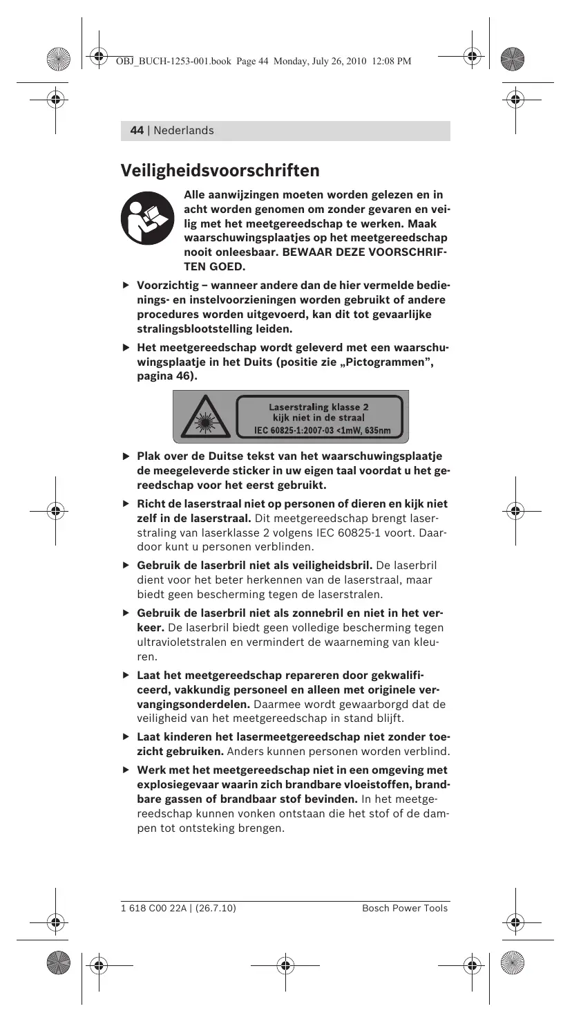 Alle aanwijzingen moeten worden gelezen en in acht worden genomen om zonder gevaren en veilig met het meetgereedschap te werken. Maak waarschuwingsplaatjes op het meetgereedschap nooit onleesbaar. BEWAAR DEZE VOORSCHRIFTEN GOED. f Voorzichtig – wanneer andere dan de hier vermelde bedienings- en instelvoorzieningen worden gebruikt of andere procedures worden uitgevoerd, kan dit tot gevaarlijke stralingsblootstelling leiden. f Het meetgereedschap wordt geleverd met een waarschuwingsplaatje in het Duits (positie zie „Pictogrammen”, pagina 46). f Plak over de Duitse tekst van het waarschuwingsplaatje de meegeleverde sticker in uw eigen taal voordat u het gereedschap voor het eerst gebruikt. f Richt de laserstraal niet op personen of dieren en kijk niet zelf in de laserstraal. Dit meetgereedschap brengt laserstraling van laserklasse 2 volgens IEC 60825-1 voort. Daardoor kunt u personen verblinden. f Gebruik de laserbril niet als veiligheidsbril. De laserbril dient voor het beter herkennen van de laserstraal, maar biedt geen bescherming tegen de laserstralen. f Gebruik de laserbril niet als zonnebril en niet in het verkeer. De laserbril biedt geen volledige bescherming tegen ultravioletstralen en vermindert de waarneming van kleuren. f Laat het meetgereedschap repareren door gekwalificeerd, vakkundig personeel en alleen met originele vervangingsonderdelen. Daarmee wordt gewaarborgd dat de veiligheid van het meetgereedschap in stand blijft. f Laat kinderen het lasermeetgereedschap niet zonder toezicht gebruiken. Anders kunnen personen worden verblind. f Werk met het meetgereedschap niet in een omgeving met explosiegevaar waarin zich brandbare vloeistoffen, brandbare gassen of brandbaar stof bevinden. In het meetgereedschap kunnen vonken ontstaan die het stof of de dampen tot ontsteking brengen. 1 618 C00 22A | (26.7.10) Bosch Power Tools OBJ_BUCH-1253-001.book Page 45 Monday, July 26, 2010 12:08 PM Nederlands | 45 Overige veiligheidsvoorschriften en tips voor de werkzaamheden f Voor het gebruik van het meetgereedschap worden alkalimangaanbatterijen geadviseerd. f Neem de batterijen uit het meetgereedschap als u het langdurig niet gebruikt. Als de batterijen lang worden bewaard, kunnen deze gaan roesten en leegraken. f Bescherm het meetgereedschap tegen vocht en fel zonlicht. f Stel het meetgereedschap niet bloot aan extreme temperaturen of temperatuurschommelingen. Laat het bijvoorbeeld niet lange tijd in de auto liggen. Laat het meetgereedschap bij grote temperatuurschommelingen eerst op de juiste temperatuur komen voordat u het in gebruik neemt. Bij extreme temperaturen of temperatuurschommelingen kan de nauwkeurigheid van het meetgereedschap nadelig worden beïnvloed. f Voorkom heftige schokken of vallen van het meetgereedschap. Door beschadigingen van het meetgereedschap kan de nauwkeurigheid worden geschaad. Vergelijk na een heftige schok of val de laserlijn ter controle met een bekende horizontale of verticale referentielijn. f Richt bij het inschakelen van het meetgereedschap de laserstraal niet op personen of dieren en kijk niet zelf in de laserstraal. Het meetgereedschap zendt onmiddellijk na het inschakelen laserstralen uit de uitgangsopening. f Schakel het meetgereedschap uit wanneer u het verplaatst of vervoert. Bij het uitschakelen wordt de pendeleenheid vergrendeld. Anders kan deze bij heftige bewegingen beschadigd raken. f Laat het ingeschakelde meetgereedschap niet onbeheerd achter en schakel het meetgereedschap na gebruik uit. Andere personen kunnen door de laserstraal verblind worden. f Gebruik altijd alleen het midden van de laserlijn voor het markeren. De breedte van de laserlijn verandert met de afstand. f Bij trillingen of veranderingen van plaats tijdens het gebruik vindt automatisch opnieuw waterpassen van het meetgereedschap plaats. Controleer na opnieuw waterpassen de stand van de horizontale en verticale laserlijn in relatie tot de referentiepunten om fouten te voorkomen. Bosch Power Tools 1 618 C00 22A | (26.7.10) OBJ_BUCH-1253-001.book Page 46 Monday, July 26, 2010 12:08 PM 46 | Nederlands Pictogrammen De volgende symbolen zijn van betekenis voor het lezen en begrijpen van de gebruiksaanwijzing. Zorg ervoor dat u de symbolen en hun betekenis herkent. Het juiste begrip van de symbolen helpt u het meetgereedschap goed en veilig te gebruiken. Symbool Betekenis Quigo: Lijnlaser Positie van het laserwaarschuwingsplaatje