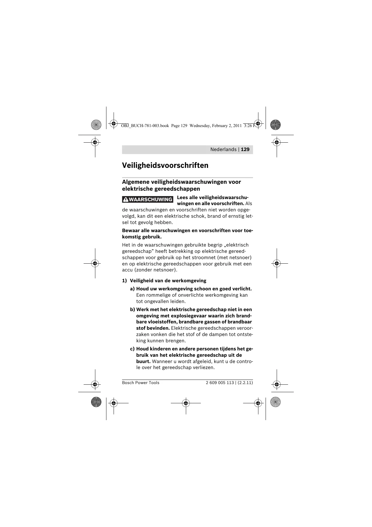 a) Houd uw werkomgeving schoon en goed verlicht. Een rommelige of onverlichte werkomgeving kan tot ongevallen leiden. b) Werk met het elektrische gereedschap niet in een omgeving met explosiegevaar waarin zich brandbare vloeistoffen, brandbare gassen of brandbaar stof bevinden. Elektrische gereedschappen veroorzaken vonken die het stof of de dampen tot ontsteking kunnen brengen. c) Houd kinderen en andere personen tijdens het gebruik van het elektrische gereedschap uit de buurt. Wanneer u wordt afgeleid, kunt u de controle over het gereedschap verliezen. Bosch Power Tools 2 609 005 113 | (2.2.11) OBJ_BUCH-781-003.book Page 130 Wednesday, February 2, 2011 3:26 PM 130 | Nederlands