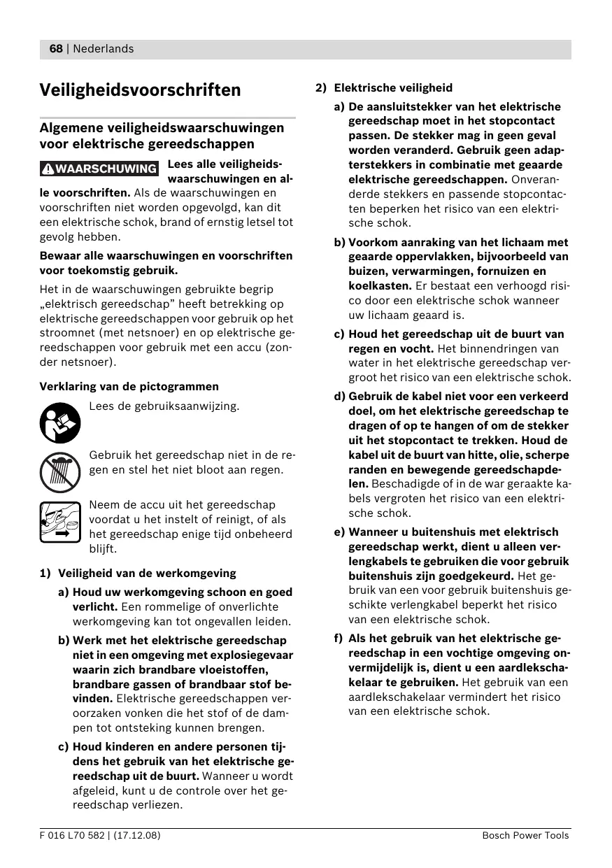 a) De aansluitstekker van het elektrische gereedschap moet in het stopcontact passen. De stekker mag in geen geval worden veranderd. Gebruik geen adapterstekkers in combinatie met geaarde elektrische gereedschappen. Onveranderde stekkers en passende stopcontacten beperken het risico van een elektrische schok. b) Voorkom aanraking van het lichaam met geaarde oppervlakken, bijvoorbeeld van buizen, verwarmingen, fornuizen en koelkasten. Er bestaat een verhoogd risico door een elektrische schok wanneer uw lichaam geaard is. c) Houd het gereedschap uit de buurt van regen en vocht. Het binnendringen van water in het elektrische gereedschap vergroot het risico van een elektrische schok. d) Gebruik de kabel niet voor een verkeerd doel, om het elektrische gereedschap te dragen of op te hangen of om de stekker uit het stopcontact te trekken. Houd de kabel uit de buurt van hitte, olie, scherpe randen en bewegende gereedschapdelen. Beschadigde of in de war geraakte kabels vergroten het risico van een elektrische schok. e) Wanneer u buitenshuis met elektrisch gereedschap werkt, dient u alleen verlengkabels te gebruiken die voor gebruik buitenshuis zijn goedgekeurd. Het gebruik van een voor gebruik buitenshuis geschikte verlengkabel beperkt het risico van een elektrische schok. f) Als het gebruik van het elektrische gereedschap in een vochtige omgeving onvermijdelijk is, dient u een aardlekschakelaar te gebruiken. Het gebruik van een aardlekschakelaar vermindert het risico van een elektrische schok. c) Houd kinderen en andere personen tijdens het gebruik van het elektrische gereedschap uit de buurt. Wanneer u wordt afgeleid, kunt u de controle over het gereedschap verliezen. F 016 L70 582 | (17.12.08) Bosch Power Tools Nederlands | 69