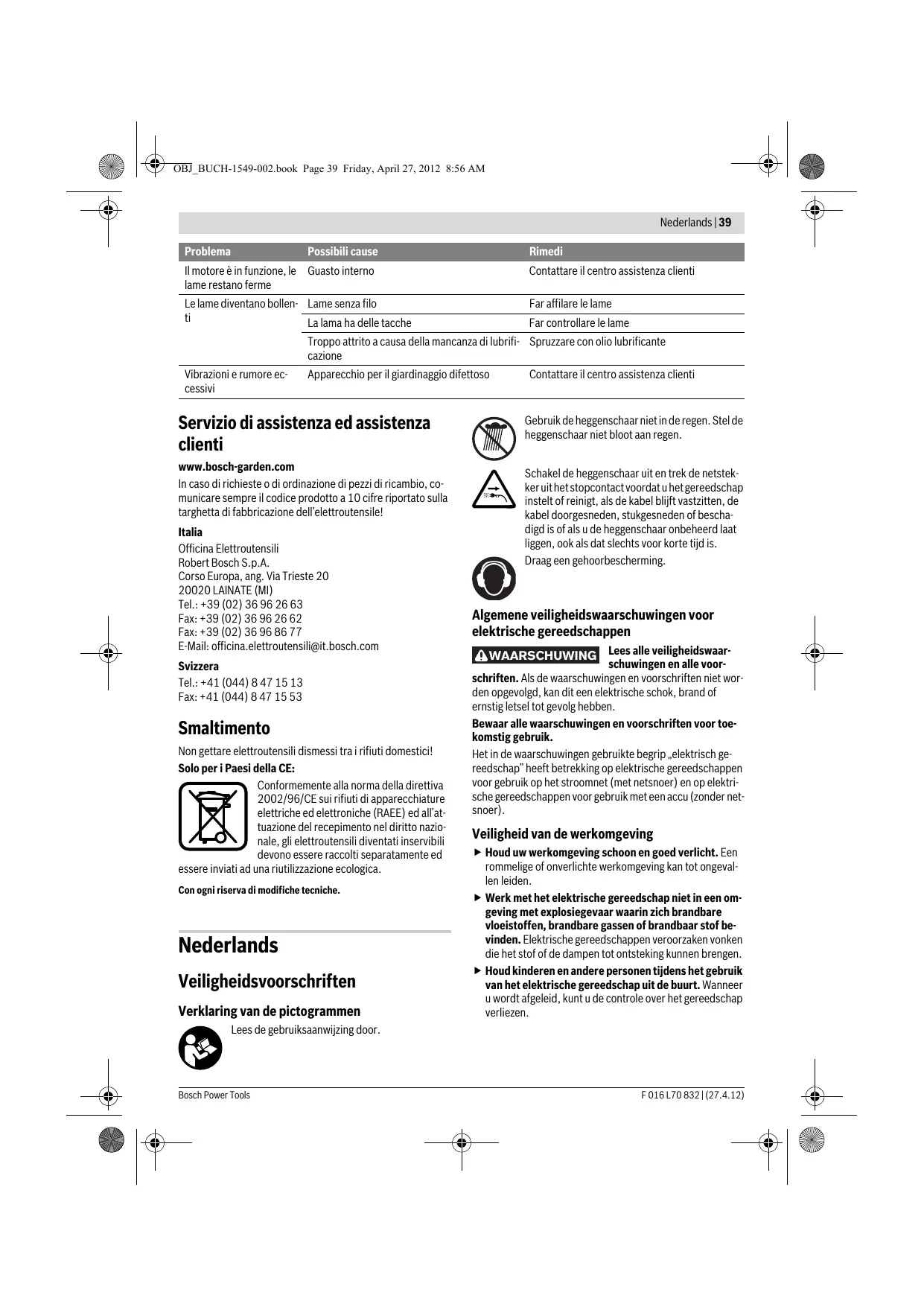 Funzione sega Nonostante l’apertura dente per taglio rami è permessa fino a Ø 26/34 mm, la punta della lama è concepita per tagli fino a Ø 32/38 mm. Individuazione dei guasti e rimedi Problema Possibili cause Rimedi La tagliasiepi non funziona Tensione di rete assente Controllare ed inserire La tagliasiepi funziona con interruzioni Presa elettrica difettosa Utilizzare un’altra presa Cavo di allacciamento collegato fisso danneggiato Controllare con cautela il cavo di allacciamento; per la sostituzione rivolgersi al Servizio di Assistenza Cavo di prolunga separato danneggiato Controllare il cavo di prolunga e sostituirlo qualora fosse danneggiato Il fusibile è scattato Sostituire il fusibile Cavo di allacciamento collegato fisso danneggiato Controllare con cautela il cavo di allacciamento; per la sostituzione rivolgersi al Servizio di Assistenza Cavo di prolunga separato danneggiato Controllare il cavo di prolunga e sostituirlo qualora fosse danneggiato Cablaggio interno dell’apparecchio per il giardi- Contattare il centro assistenza clienti naggio difettoso Interruttore di avvio/arresto difettoso F 016 L70 832 | (27.4.12) Contattare il centro assistenza clienti Bosch Power Tools OBJ_BUCH-1549-002.book Page 39 Friday, April 27, 2012 8:56 AM Nederlands | 39 Problema Possibili cause Rimedi Il motore è in funzione, le Guasto interno lame restano ferme Contattare il centro assistenza clienti Le lame diventano bollen- Lame senza filo La lama ha delle tacche Far affilare le lame Far controllare le lame Troppo attrito a causa della mancanza di lubrifi- Spruzzare con olio lubrificante cazione Vibrazioni e rumore eccessivi Apparecchio per il giardinaggio difettoso Servizio di assistenza ed assistenza clienti www.bosch-garden.com In caso di richieste o di ordinazione di pezzi di ricambio, comunicare sempre il codice prodotto a 10 cifre riportato sulla targhetta di fabbricazione dell’elettroutensile! Italia Officina Elettroutensili Robert Bosch S.p.A. Corso Europa, ang. Via Trieste 20 20020 LAINATE (MI) Tel.: +39 (02) 36 96 26 63 Fax: +39 (02) 36 96 26 62 Fax: +39 (02) 36 96 86 77 E-Mail: officina.elettroutensili@it.bosch.com Svizzera Tel.: +41 (044) 8 47 15 13 Fax: +41 (044) 8 47 15 53 Smaltimento Non gettare elettroutensili dismessi tra i rifiuti domestici! Solo per i Paesi della CE: Conformemente alla norma della direttiva 2002/96/CE sui rifiuti di apparecchiature elettriche ed elettroniche (RAEE) ed all’attuazione del recepimento nel diritto nazionale, gli elettroutensili diventati inservibili devono essere raccolti separatamente ed essere inviati ad una riutilizzazione ecologica. Con ogni riserva di modifiche tecniche. Nederlands Veiligheidsvoorschriften Verklaring van de pictogrammen Contattare il centro assistenza clienti Gebruik de heggenschaar niet in de regen. Stel de heggenschaar niet bloot aan regen. Schakel de heggenschaar uit en trek de netstekker uit het stopcontact voordat u het gereedschap instelt of reinigt, als de kabel blijft vastzitten, de kabel doorgesneden, stukgesneden of beschadigd is of als u de heggenschaar onbeheerd laat liggen, ook als dat slechts voor korte tijd is. Draag een gehoorbescherming. Algemene veiligheidswaarschuwingen voor elektrische gereedschappen WAARSCHUWING Lees alle veiligheidswaarschuwingen en alle voorschriften. Als de waarschuwingen en voorschriften niet worden opgevolgd, kan dit een elektrische schok, brand of ernstig letsel tot gevolg hebben. Bewaar alle waarschuwingen en voorschriften voor toekomstig gebruik. Het in de waarschuwingen gebruikte begrip „elektrisch gereedschap” heeft betrekking op elektrische gereedschappen voor gebruik op het stroomnet (met netsnoer) en op elektrische gereedschappen voor gebruik met een accu (zonder netsnoer). Veiligheid van de werkomgeving f Houd uw werkomgeving schoon en goed verlicht. Een rommelige of onverlichte werkomgeving kan tot ongevallen leiden. f Werk met het elektrische gereedschap niet in een omgeving met explosiegevaar waarin zich brandbare vloeistoffen, brandbare gassen of brandbaar stof bevinden. Elektrische gereedschappen veroorzaken vonken die het stof of de dampen tot ontsteking kunnen brengen. f Houd kinderen en andere personen tijdens het gebruik van het elektrische gereedschap uit de buurt. Wanneer u wordt afgeleid, kunt u de controle over het gereedschap verliezen. Lees de gebruiksaanwijzing door. Bosch Power Tools F 016 L70 832 | (27.4.12) OBJ_BUCH-1549-002.book Page 40 Friday, April 27, 2012 8:56 AM 40 | Nederlands Elektrische veiligheid f De aansluitstekker van het elektrische gereedschap moet in het stopcontact passen. De stekker mag in geen geval worden veranderd. Gebruik geen adapterstekkers in combinatie met geaarde elektrische gereedschappen. Onveranderde stekkers en passende stopcontacten beperken het risico van een elektrische schok. f Voorkom aanraking van het lichaam met geaarde oppervlakken, bijvoorbeeld van buizen, verwarmingen, fornuizen en koelkasten. Er bestaat een verhoogd risico door een elektrische schok wanneer uw lichaam geaard is. f Houd het gereedschap uit de buurt van regen en vocht. Het binnendringen van water in het elektrische gereedschap vergroot het risico van een elektrische schok. f Gebruik de kabel niet voor een verkeerd doel, om het elektrische gereedschap te dragen of op te hangen of om de stekker uit het stopcontact te trekken. Houd de kabel uit de buurt van hitte, olie, scherpe randen en bewegende gereedschapdelen. Beschadigde of in de war geraakte kabels vergroten het risico van een elektrische schok. f Wanneer u buitenshuis met elektrisch gereedschap werkt, dient u alleen verlengkabels te gebruiken die voor gebruik buitenshuis zijn goedgekeurd. Het gebruik van een voor gebruik buitenshuis geschikte verlengkabel beperkt het risico van een elektrische schok. f Als het gebruik van het elektrische gereedschap in een vochtige omgeving onvermijdelijk is, dient u een aardlekschakelaar te gebruiken. Het gebruik van een aardlekschakelaar vermind