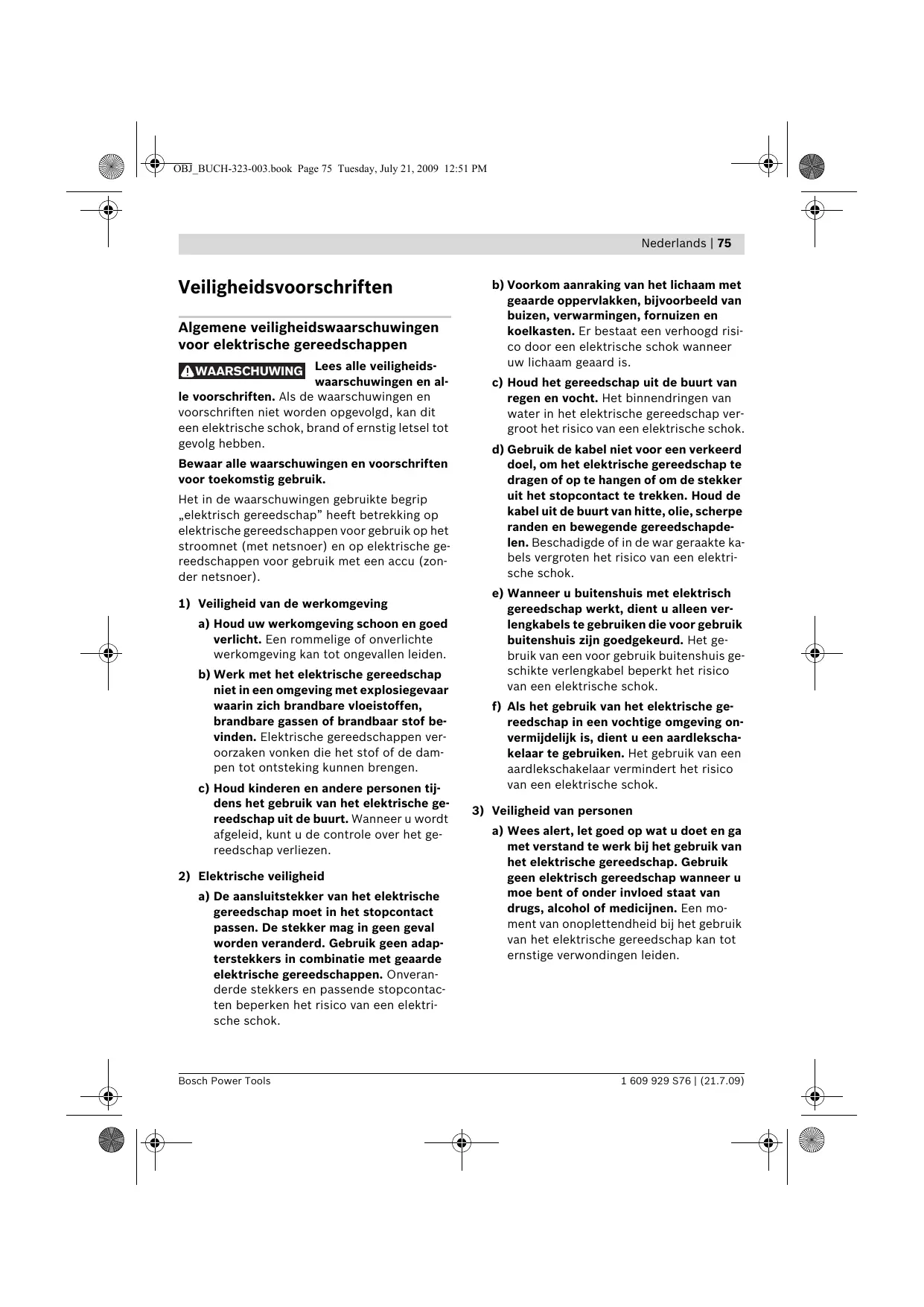 OBJ_BUCH-323-003.book Page 77 Tuesday, July 21, 2009 12:51 PM Nederlands | 77 g) Gebruik elektrisch gereedschap, toebehoren, inzetgereedschappen en dergelijke volgens deze aanwijzingen. Let daarbij op de arbeidsomstandigheden en de uit te voeren werkzaamheden. Het gebruik van elektrische gereedschappen voor andere dan de voorziene toepassingen kan tot gevaarlijke situaties leiden. 5) Service a) Laat het elektrische gereedschap alleen repareren door gekwalificeerd en vakkundig personeel en alleen met originele vervangingsonderdelen. Daarmee wordt gewaarborgd dat de veiligheid van het gereedschap in stand blijft.