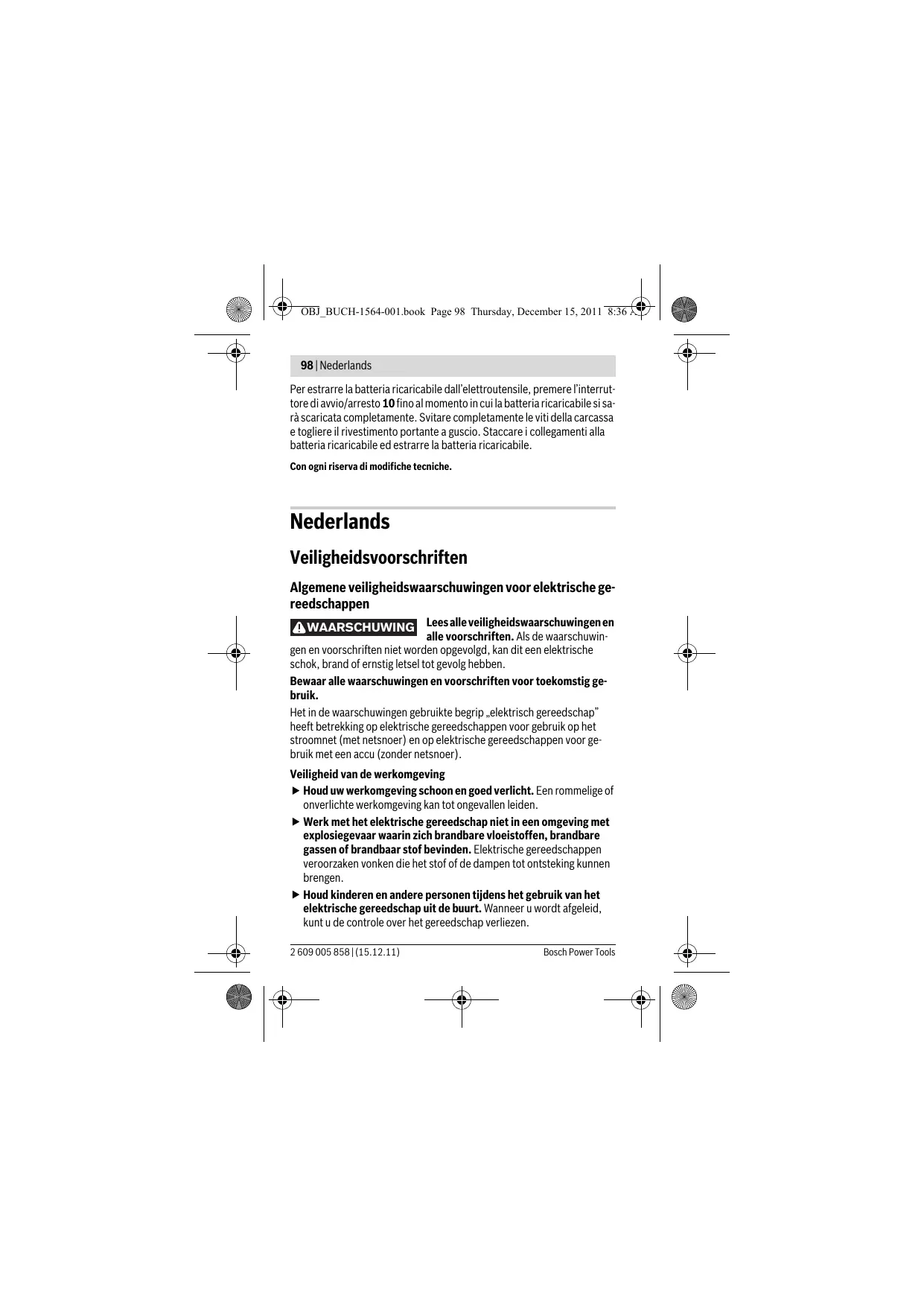 /II Let op het zaaknummer op het typeplaatje van het elektrische gereedschap. De handelsbenamingen van sommige elektrische gereedschappen kunnen afwijken. Informatie over geluid en trillingen Meetwaarden voor geluid bepaald volgens EN 60745. Het A-gewogen geluidsdrukniveau van het gereedschap is kenmerkend lager dan 70 dB(A). Onzekerheid K =3 dB. Het geluidsniveau tijdens de werkzaamheden kan 80 dB(A) overschrijden. Draag een gehoorbescherming. Totale trillingswaarden ah (vectorsom van drie richtingen) en onzekerheid K bepaald volgens EN 60745: schroeven: ah <2,5 m/s2, K=1,5 m/s2. Het in deze gebruiksaanwijzing vermelde trillingsniveau is gemeten met een volgens EN 60745 genormeerde meetmethode en kan worden gebruikt om elektrische gereedschappen met elkaar te vergelijken. Het is ook geschikt voor een voorlopige inschatting van de trillingsbelasting. Het aangegeven trillingsniveau representeert de voornaamste toepassingen van het elektrische gereedschap. Als echter het elektrische gereedschap wordt gebruikt voor andere toepassingen, met afwijkende inzetgereedschappen of onvoldoende onderhoud, kan het trillingsniveau afwijken. Dit kan de trillingsbelasting gedurende de gehele arbeidsperiode duidelijk verhogen. Voor een nauwkeurige schatting van de trillingsbelasting moet ook rekening worden gehouden met de tijd waarin het gereedschap uitgeschakeld is, of waarin het gereedschap wel loopt, maar niet werkelijk wordt gebruikt. Dit kan de trillingsbelasting gedurende de gehele arbeidsperiode duidelijk verminderen. Bosch Power Tools 2 609 005 858 | (15.12.11) OBJ_BUCH-1564-001.book Page 106 Thursday, December 15, 2011 8:36 AM 106 | Nederlands Leg aanvullende veiligheidsmaatregelen ter bescherming van de bediener tegen het effect van trillingen vast, zoals: Onderhoud van elektrische gereedschappen en inzetgereedschappen, warm houden van de handen, organisatie van het arbeidsproces. Conformiteitsverklaring Wij verklaren als alleen verantwoordelijke dat het onder „Technische gegevens” beschreven product voldoet aan de volgende normen en normatieve documenten: EN 60745 (accugereedschappen) resp. EN 60335 (accu-oplaadapparaten) volgens de bepalingen van de richtlijnen 2011/65/EU, 2006/95/EG, 2004/108/EG, 2006/42/EG. Technisch dossier (2006/42/EG) bij: Robert Bosch GmbH, PT/ETM9, D-70745 Leinfelden-Echterdingen Dr. Egbert Schneider Dr. Eckerhard Strötgen Senior Vice President Engineering Director Engineering PT/ESI Robert Bosch GmbH, Power Tools Division D-70745 Leinfelden-Echterdingen