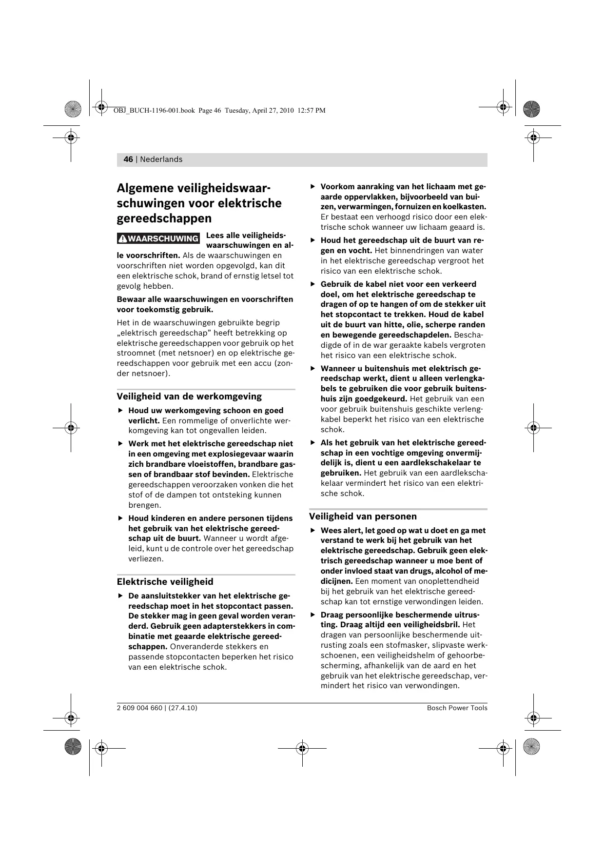 WAARSCHUWING Lees alle veiligheidswaarschuwingen en alle voorschriften. Als de waarschuwingen en voorschriften niet worden opgevolgd, kan dit een elektrische schok, brand of ernstig letsel tot gevolg hebben. Bewaar alle waarschuwingen en voorschriften voor toekomstig gebruik. Het in de waarschuwingen gebruikte begrip „elektrisch gereedschap” heeft betrekking op elektrische gereedschappen voor gebruik op het stroomnet (met netsnoer) en op elektrische gereedschappen voor gebruik met een accu (zonder netsnoer). Veiligheid van de werkomgeving f Houd uw werkomgeving schoon en goed verlicht. Een rommelige of onverlichte werkomgeving kan tot ongevallen leiden. f Voorkom aanraking van het lichaam met geaarde oppervlakken, bijvoorbeeld van buizen, verwarmingen, fornuizen en koelkasten. Er bestaat een verhoogd risico door een elektrische schok wanneer uw lichaam geaard is. f Houd het gereedschap uit de buurt van regen en vocht. Het binnendringen van water in het elektrische gereedschap vergroot het risico van een elektrische schok. f Gebruik de kabel niet voor een verkeerd doel, om het elektrische gereedschap te dragen of op te hangen of om de stekker uit het stopcontact te trekken. Houd de kabel uit de buurt van hitte, olie, scherpe randen en bewegende gereedschapdelen. Beschadigde of in de war geraakte kabels vergroten het risico van een elektrische schok. f Wanneer u buitenshuis met elektrisch gereedschap werkt, dient u alleen verlengkabels te gebruiken die voor gebruik buitenshuis zijn goedgekeurd. Het gebruik van een voor gebruik buitenshuis geschikte verlengkabel beperkt het risico van een elektrische schok. f Werk met het elektrische gereedschap niet in een omgeving met explosiegevaar waarin zich brandbare vloeistoffen, brandbare gassen of brandbaar stof bevinden. Elektrische gereedschappen veroorzaken vonken die het stof of de dampen tot ontsteking kunnen brengen. f Als het gebruik van het elektrische gereedschap in een vochtige omgeving onvermijdelijk is, dient u een aardlekschakelaar te gebruiken. Het gebruik van een aardlekschakelaar vermindert het risico van een elektrische schok. f Houd kinderen en andere personen tijdens het gebruik van het elektrische gereedschap uit de buurt. Wanneer u wordt afgeleid, kunt u de controle over het gereedschap verliezen. Veiligheid van personen Elektrische veiligheid f De aansluitstekker van het elektrische gereedschap moet in het stopcontact passen. De stekker mag in geen geval worden veranderd. Gebruik geen adapterstekkers in combinatie met geaarde elektrische gereedschappen. Onveranderde stekkers en passende stopcontacten beperken het risico van een elektrische schok. 2 609 004 660 | (27.4.10) f Wees alert, let goed op wat u doet en ga met verstand te werk bij het gebruik van het elektrische gereedschap. Gebruik geen elektrisch gereedschap wanneer u moe bent of onder invloed staat van drugs, alcohol of medicijnen. Een moment van onoplettendheid bij het gebruik van het elektrische gereedschap kan tot ernstige verwondingen leiden. f Draag persoonlijke beschermende uitrusting. Draag altijd een veiligheidsbril. Het dragen van persoonlijke beschermende uitrusting zoals een stofmasker, slipvaste werkschoenen, een veiligheidshelm of gehoorbescherming, afhankelijk van de aard en het gebruik van het elektrische gereedschap, vermindert het risico van verwondingen. Bosch Power Tools OBJ_BUCH-1196-001.book Page 47 Tuesday, April 27, 2010 12:57 PM Nederlands | 47 f Voorkom per ongeluk inschakelen. Controleer dat het elektrische gereedschap uitgeschakeld is voordat u de stekker in het stopcontact steekt of de accu aansluit en voordat u het gereedschap oppakt of draagt. Wanneer u bij het dragen van het elektrische gereedschap uw vinger aan de schakelaar hebt of wanneer u het gereedschap ingeschakeld op de stroomvoorziening aansluit, kan dit tot ongevallen leiden. f Verwijder instelgereedschappen of schroefsleutels voordat u het elektrische gereedschap inschakelt. Een instelgereedschap of sleutel in een draaiend deel van het gereedschap kan tot verwondingen leiden. f Voorkom een onevenwichtige lichaamshouding. Zorg ervoor dat u stevig staat en steeds in evenwicht blijft. Daardoor kunt u het elektrische gereedschap in onverwachte situaties beter onder controle houden. f Draag geschikte kleding. Draag geen loshangende kleding of sieraden. Houd haren, kleding en handschoenen uit de buurt van bewegende delen. Loshangende kleding, lange haren en sieraden kunnen door bewegende delen worden meegenomen. f Wanneer stofafzuigings- of stofopvangvoorzieningen kunnen worden gemonteerd, dient u zich ervan te verzekeren dat deze zijn aangesloten en juist worden gebruikt. Het gebruik van een stofafzuiging beperkt het gevaar door stof. Zorgvuldige omgang met en zorgvuldig gebruik van elektrische gereedschappen f Overbelast het gereedschap niet. Gebruik voor uw werkzaamheden het daarvoor bestemde elektrische gereedschap. Met het passende elektrische gereedschap werkt u beter en veiliger binnen het aangegeven capaciteitsbereik. f Gebruik geen elektrisch gereedschap waarvan de schakelaar defect is. Elektrisch gereedschap dat niet meer kan worden in- of uitgeschakeld, is gevaarlijk en moet worden gerepareerd. Bosch Power Tools f Trek de stekker uit het stopcontact of neem de accu uit het elektrische gereedschap voordat u het gereedschap instelt, toebehoren wisselt of het gereedschap weglegt. Deze voorzorgsmaatregel voorkomt onbedoeld starten van het elektrische gereedschap. f Bewaar niet-gebruikte elektrische gereedschappen buiten bereik van kinderen. Laat het gereedschap niet gebruiken door personen die er niet mee vertrouwd zijn en deze aanwijzingen niet hebben gelezen. Elektrische gereedschappen zijn gevaarlijk wanneer deze door onervaren personen worden gebruikt. f Verzorg het elektrische gereedschap zorgvuldig. Controleer of bewegende delen van het gereedschap correct functioneren en niet vastklemmen en of onderdelen zodanig gebroken of beschadigd zijn dat de werking van het 