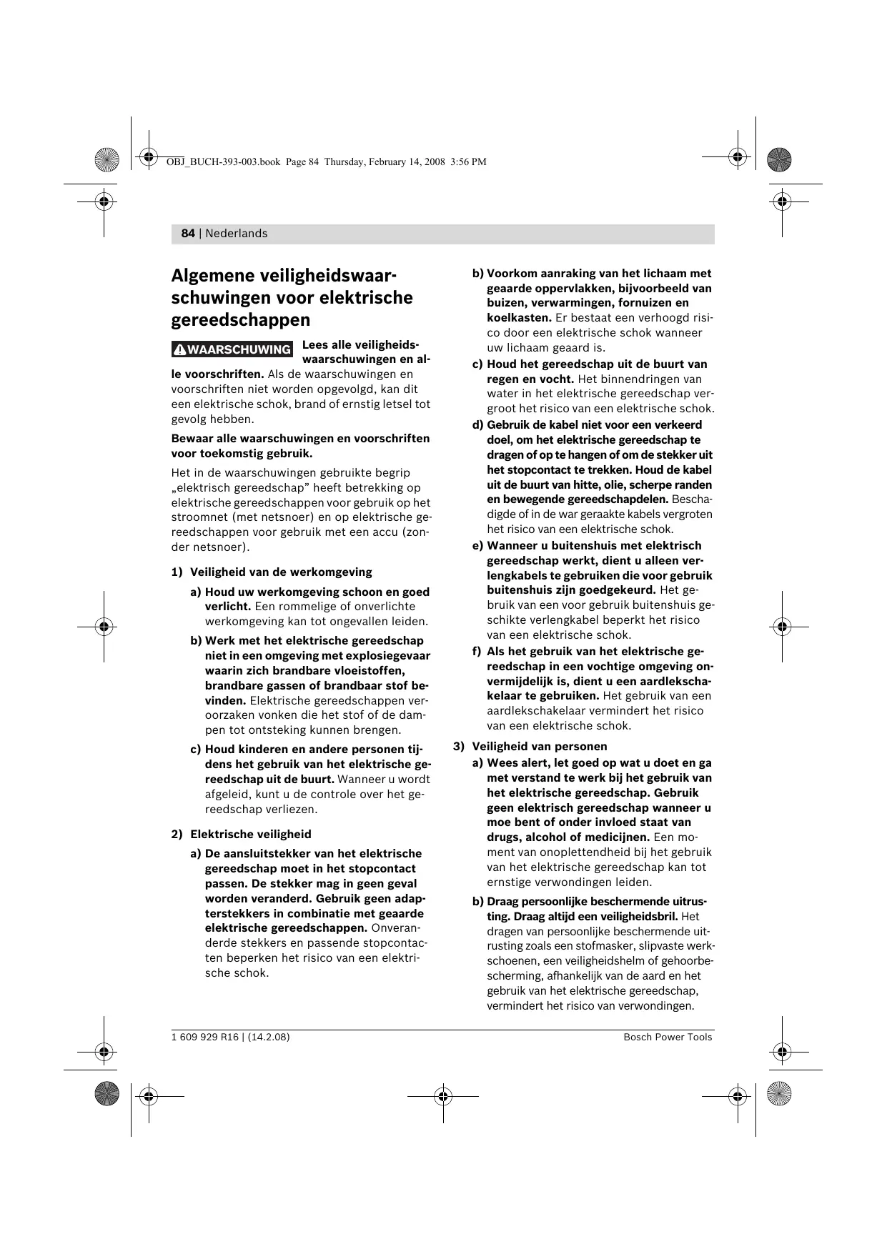 a) Wees alert, let goed op wat u doet en ga met verstand te werk bij het gebruik van het elektrische gereedschap. Gebruik geen elektrisch gereedschap wanneer u moe bent of onder invloed staat van drugs, alcohol of medicijnen. Een moment van onoplettendheid bij het gebruik van het elektrische gereedschap kan tot ernstige verwondingen leiden. b) Draag persoonlijke beschermende uitrusting. Draag altijd een veiligheidsbril. Het dragen van persoonlijke beschermende uitrusting zoals een stofmasker, slipvaste werkschoenen, een veiligheidshelm of gehoorbescherming, afhankelijk van de aard en het gebruik van het elektrische gereedschap, vermindert het risico van verwondingen. Bosch Power Tools OBJ_BUCH-393-003.book Page 85 Thursday, February 14, 2008 3:56 PM Nederlands | 85 c) Voorkom per ongeluk inschakelen. Controleer dat het elektrische gereedschap uitgeschakeld is voordat u de stekker in het stopcontact steekt of de accu aansluit en voordat u het gereedschap oppakt of draagt. Wanneer u bij het dragen van het elektrische gereedschap uw vinger aan de schakelaar hebt of wanneer u het gereedschap ingeschakeld op de stroomvoorziening aansluit, kan dit tot ongevallen leiden. d) Verwijder instelgereedschappen of schroefsleutels voordat u het elektrische gereedschap inschakelt. Een instelgereedschap of sleutel in een draaiend deel van het gereedschap kan tot verwondingen leiden. e) Voorkom een onevenwichtige lichaamshouding. Zorg ervoor dat u stevig staat en steeds in evenwicht blijft. Daardoor kunt u het elektrische gereedschap in onverwachte situaties beter onder controle houden. f) Draag geschikte kleding. Draag geen loshangende kleding of sieraden. Houd haren, kleding en handschoenen uit de buurt van bewegende delen. Loshangende kleding, lange haren en sieraden kunnen door bewegende delen worden meegenomen. g) Wanneer stofafzuigings- of stofopvangvoorzieningen kunnen worden gemonteerd, dient u zich ervan te verzekeren dat deze zijn aangesloten en juist worden gebruikt. Het gebruik van een stofafzuiging beperkt het gevaar door stof.