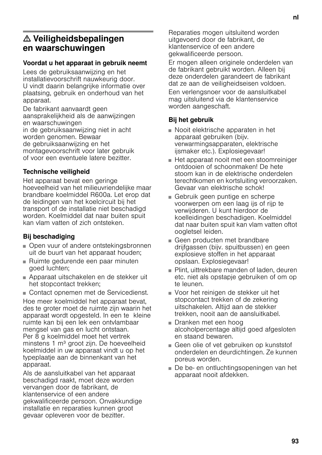 m Veiligheidsbepalingen en waarschuwingen Voordat u het apparaat in gebruik neemt Lees de gebruiksaanwijzing en het installatievoorschrift nauwkeurig door. U vindt daarin belangrijke informatie over plaatsing, gebruik en onderhoud van het apparaat. De fabrikant aanvaardt geen aansprakelijkheid als de aanwijzingen en waarschuwingen in de gebruiksaanwijzing niet in acht worden genomen. Bewaar de gebruiksaanwijzing en het montagevoorschrift voor later gebruik of voor een eventuele latere bezitter. Technische veiligheid Het apparaat bevat een geringe hoeveelheid van het milieuvriendelijke maar brandbare koelmiddel R600a. Let erop dat de leidingen van het koelcircuit bij het transport of de installatie niet beschadigd worden. Koelmiddel dat naar buiten spuit kan vlam vatten of zich ontsteken. Bij beschadiging ■ Open vuur of andere ontstekingsbronnen uit de buurt van het apparaat houden; ■ Ruimte gedurende een paar minuten goed luchten; ■ Apparaat uitschakelen en de stekker uit het stopcontact trekken; ■ Contact opnemen met de Servicedienst. Hoe meer koelmiddel het apparaat bevat, des te groter moet de ruimte zijn waarin het apparaat wordt opgesteld. In een te kleine ruimte kan bij een lek een ontvlambaar mengsel van gas en lucht ontstaan. Per 8 g koelmiddel moet het vertrek minstens 1 m³ groot zijn. De hoeveelheid koelmiddel in uw apparaat vindt u op het typeplaatje aan de binnenkant van het apparaat. Als de aansluitkabel van het apparaat beschadigd raakt, moet deze worden vervangen door de fabrikant, de klantenservice of een andere gekwalificeerde persoon. Onvakkundige installatie en reparaties kunnen groot gevaar opleveren voor de bezitter. Reparaties mogen uitsluitend worden uitgevoerd door de fabrikant, de klantenservice of een andere gekwalificeerde persoon. Er mogen alleen originele onderdelen van de fabrikant gebruikt worden. Alleen bij deze onderdelen garandeert de fabrikant dat ze aan de veiligheidseisen voldoen. Een verlengsnoer voor de aansluitkabel mag uitsluitend via de klantenservice worden aangeschaft. Bij het gebruik