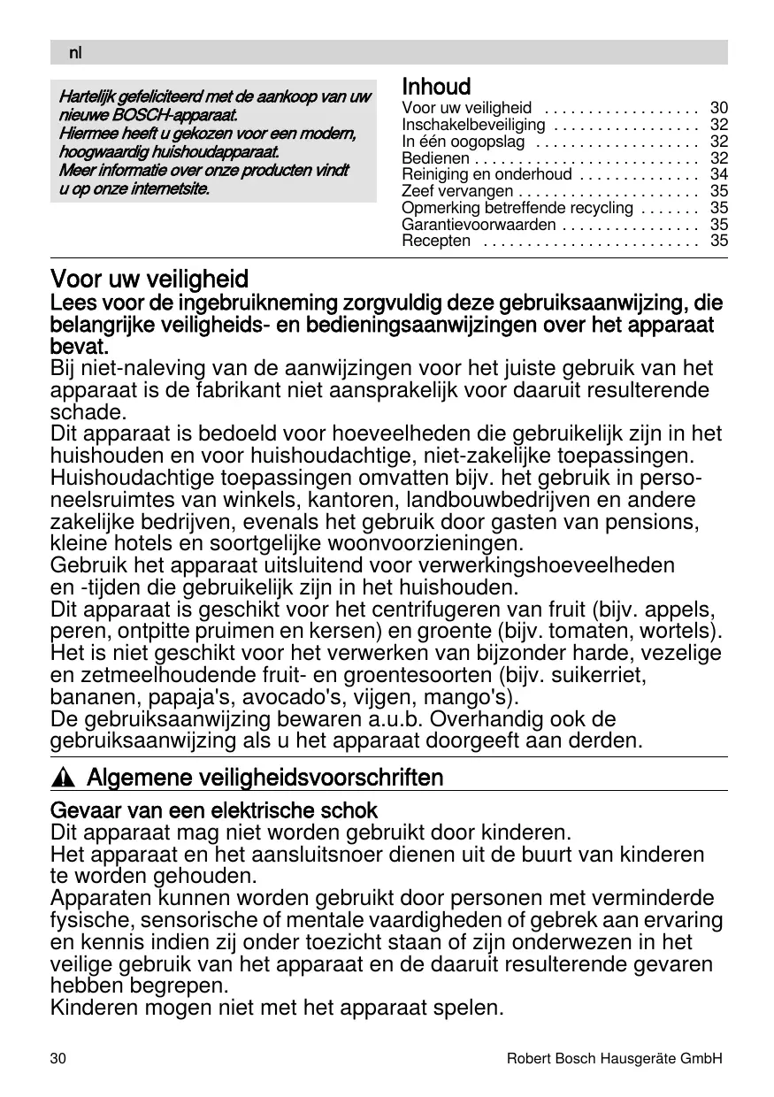 , Veiligheidsvoorschriften voor dit apparaat Gevaar van elektrische schok! Verwondingsgevaar! Het basisapparaat niet in vloeistof dompelen en niet reinigen in de afwasautomaat. Het apparaat uitsluitend in- en uitschakelen met de draaischakelaar. Voordat u toebehoren of hulpstukken vervangt die bewegen tijdens het gebruik, moet het apparaat worden uitgeschakeld en worden losgemaakt van het stroomnet. Neem het apparaat pas uit elkaar wanneer de motor stilstaat. Het apparaat is bedoeld voor gebruik door één persoon. Verwondingsgevaar! Wees voorzichtig bij het sluiten van de sluitbeugel, om te voorkomen dat uw vingers bekneld raken. Niet met de vingers in de vulopening grijpen. Altijd de bijgevoegde stopper gebruiken! Raspmessen/messen op de bodem van de zeef niet aanraken. De zeef eerst reinigen met de borstel en dan afspoelen onder stromend water of in de afwasautomaat. Belangrijk! Verwerk alleen rijp(e) en niet-bevroren fruit en groente. Bij onrijp fruit en onrijpe groente raakt de zeef zeer snel verstopt. Pulpbak leegmaken voordat de pulp de rand van het zeefbakje bereikt. Trillingen van het apparaat tijdens het centrifugeren wijzen op een verstopte of beschadigde zeef. Het apparaat direct uitschakelen. Zeef controleren. Een beschadigde zeef niet meer gebruiken! Robert Bosch Hausgeräte GmbH