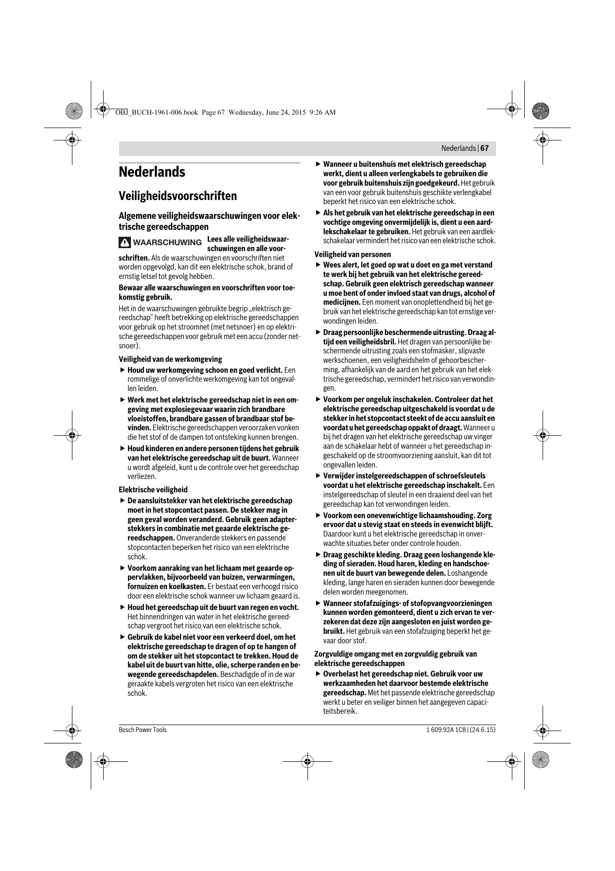 m/s2 m/s2 7,0 1,5 8,0 1,5 13,0 1,5 m/s2 m/s2 5,0 1,5 5,0 1,5 6,0 1,5 1 609 92A 1C8 | (24.6.15) OBJ_BUCH-1961-006.book Page 72 Wednesday, June 24, 2015 9:26 AM 72 | Nederlands Het in deze gebruiksaanwijzing vermelde trillingsniveau is gemeten met een volgens EN 60745 genormeerde meetmethode en kan worden gebruikt om elektrische gereedschappen met elkaar te vergelijken. Het is ook geschikt voor een voorlopige inschatting van de trillingsbelasting. Het aangegeven trillingsniveau representeert de voornaamste toepassingen van het elektrische gereedschap. Als echter het elektrische gereedschap wordt gebruikt voor andere toepassingen, met verschillende accessoire, met afwijkende inzetgereedschappen of onvoldoende onderhoud, kan het trillingsniveau afwijken. Dit kan de trillingsbelasting gedurende de gehele arbeidsperiode duidelijk verhogen. Voor een nauwkeurige schatting van de trillingsbelasting moet ook rekening worden gehouden met de tijd waarin het gereedschap uitgeschakeld is, of waarin het gereedschap wel loopt, maar niet werkelijk wordt gebruikt. Dit kan de trillingsbelasting gedurende de gehele arbeidsperiode duidelijk verminderen. Leg aanvullende veiligheidsmaatregelen ter bescherming van de bediener tegen het effect van trillingen vast, zoals: Onderhoud van elektrische gereedschappen en inzetgereedschappen, warm houden van de handen, organisatie van het arbeidsproces. Conformiteitsverklaring We verklaren op onze verantwoordelijkheid dat het onder „Technische gegevens” beschreven product aan alle desbetreffende bepalingen van de richtlijnen 2011/65/EU, tot 19 april 2016: 2004/108/EG, vanaf 20 april 2016: 2014/30/EU, 2006/42/EG inclusief van de wijzigingen ervan voldoet en met de volgende normen overeenstemt EN 60745-1, EN 60745-2-3. Technisch dossier (2006/42/EG) bij: Robert Bosch GmbH, PT/ETM9, 70764 Leinfelden-Echterdingen, GERMANY Henk Becker Helmut Heinzelmann Executive Vice President Head of Product Certification Engineering PT/ETM9 Robert Bosch GmbH, Power Tools Division 70764 Leinfelden-Echterdingen, GERMANY Leinfelden, 24.06.2015 Montage Beschermingsvoorzieningen monteren Trek altijd voor werkzaamheden aan het elektrische gereedschap de stekker uit het stopcontact. Opmerking: Na breuk van de slijpschijf tijdens het gebruik of bij beschadiging van de opnamevoorzieningen van de beschermkap of van het elektrische gereedschap moet het gereedschap zo spoedig mogelijk aan de klantenservice worden gestuurd. Zie voor adressen het gedeelte „Klantenservice en gebruiksadviezen”. 1 609 92A 1C8 | (24.6.15) Beschermkap voor schuren Leg de beschermkap 7 op de opname van het elektrische gereedschap tot de codeernokken van de beschermkap met de opname overeenkomen. Houd daarbij de ontgrendelingshendel 1 ingedrukt. Druk de beschermkap 7 op de ashals tot de kraag van de beschermkap op de flens van het elektrische gereedschap zit en draai de beschermkap tot deze duidelijk hoorbaar vastklikt. Pas de positie van de beschermkap 7 aan de eisen van de bewerking aan. Druk daarvoor de ontgrendelingshendel 1 omhoog en draai de beschermkap 7 in de gewenste stand. Stel de beschermkap 7 altijd zo in dat alle drie rode nokken van de ontgrendelingshendel 1 in de bijbehorende uitsparingen van de beschermkap 7 grijpen. Stel de beschermkap 7 zo in dat er geen vonken in de richting van de bediener vliegen. De beschermkap 7 mag alleen kunnen worden verdraaid terwijl de ontgrendelingshendel 1 wordt bediend. Anders mag u het elektrische gereedschap in geen geval verder gebruiken, maar moet u het aan de de klantenservice versturen. Opmerking: De codeernokken op de beschermkap 7 zorgen ervoor dat er alleen een bij het elektrische gereedschap passende beschermkap gemonteerd kan worden. Beschermkap voor doorslijpen Gebruik bij doorslijpwerkzaamheden met gebonden slijpmiddelen altijd de beschermkap voor doorslijpen Zorg bij doorslijpwerkzaamheden in steen voor een voldoende stofafzuiging. De afzuigkap voor doorslijpen 12 wordt net als de beschermkap voor schuren 7 gemonteerd. Afzuigkap voor doorslijpen met geleidingsslede De afzuigkap voor doorslijpen met geleidingsslede 19 wordt net als de beschermkap voor schuren 7 gemonteerd. Extra handgreep Gebruik het elektrische gereedschap alleen met de extra handgreep 5. Schroef de extra handgreep 5 afhankelijk van de werkwijze rechts of links op het voorste deel van de machine vast. Handbescherming Monteer voor werkzaamheden met de rubber steunschijf 15, komstaalborstel, vlakstaalborstel of lamellenschijf altijd de handbescherming 14. Bevestig de handbescherming 14 met de extra handgreep 5. Bosch Power Tools OBJ_BUCH-1961-006.book Page 73 Wednesday, June 24, 2015 9:26 AM Nederlands | 73 Slijpgereedschappen monteren Trek altijd voor werkzaamheden aan het elektrische gereedschap de stekker uit het stopcontact. Raak slijp- en doorslijpschijven niet aan voordat deze zijn afgekoeld. De schijven worden tijdens de werkzaamheden zeer heet. Reinig de uitgaande as 6 en alle te monteren delen. Druk voor het vastspannen en losdraaien van de slijpgereedschappen op de blokkeerknop 2 om de uitgaande as vast te zetten. Bedien de blokkeerknop alleen als de uitgaande as stilstaat. Anders kan het elektrische gereedschap beschadigd raken. Slijp- of doorslijpschijf Let op de afmetingen van de slijpgereedschappen. De gatdiameter moet bij de opnameflens passen. Gebruik geen adapters of reduceerstukken. Let er bij het gebruik van diamantdoorslijpschijven op dat de draairichtingpijl op de diamantdoorslijpschijf en de draairichting van het elektrische gereedschap (zie draairichtingpijl op de voorzijde van de machine) overeenkomen. De volgorde van de montage kunt u op de pagina met afbeeldingen zien. Voor het bevestigen van de slijp- of doorslijpschijf schroeft u de spanmoer 10 op de as en spant u de spanmoer met de pensleutel. Controleer na de montage van het slijpgereedschap en vóór het inschakelen of het slijpgereedschap correct is gemonteerd en vrij kan draaien. Controleer dat het schuurgeree