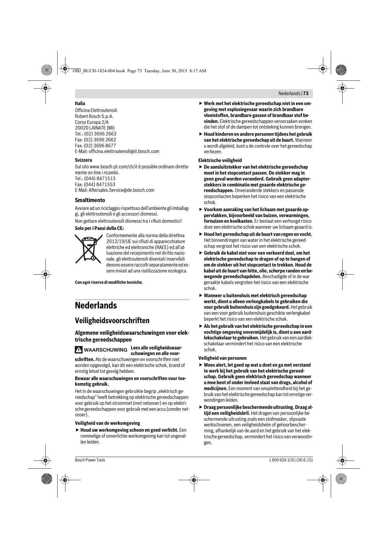 1,8 1,8 1,8 1,8 1,8 1,8 /II 1,8 /II 1,8 /II 1,8 /II 1,8 /II De gegevens gelden voor nominale spanningen [U] 230 V. Bij afwijkende spanningen en bij per land verschillende uitvoeringen kunnen deze gegevens afwijken. Conformiteitsverklaring We verklaren op onze verantwoordelijkheid dat het onder „Technische gegevens” beschreven product aan alle desbetreffende bepalingen van de richtlijnen 2011/65/EU, tot 19 april 2016: 2004/108/EG, vanaf 20 april 2016: 2014/30/EU, 2006/42/EG inclusief van de wijzigingen ervan voldoet en met de volgende normen overeenstemt EN 60745-1, EN 60745-2-3. Technisch dossier (2006/42/EG) bij: Robert Bosch GmbH, PT/ETM9, 70764 Leinfelden-Echterdingen, GERMANY Henk Becker Helmut Heinzelmann Executive Vice President Head of Product Certification Engineering PT/ETM9 Robert Bosch GmbH, Power Tools Division 70764 Leinfelden-Echterdingen, GERMANY Leinfelden, 01.06.2015 Montage Beschermingsvoorzieningen monteren Trek altijd voor werkzaamheden aan het elektrische gereedschap de stekker uit het stopcontact. Opmerking: Na breuk van de slijpschijf tijdens het gebruik of bij beschadiging van de opnamevoorzieningen van de beschermkap of van het elektrische gereedschap moet het gereedschap zo spoedig mogelijk aan de klantenservice worden gestuurd. Zie voor adressen het gedeelte „Klantenservice en gebruiksadviezen”. 1 609 92A 1C6 | (30.6.15) Beschermkap voor schuren Leg de beschermkap 6 op de opname van het elektrische gereedschap tot de codeernokken van de beschermkap met de opname overeenkomen. Houd daarbij de ontgrendelingshendel 1 ingedrukt. Druk de beschermkap 6 op de ashals tot de kraag van de beschermkap op de flens van het elektrische gereedschap zit en draai de beschermkap tot deze duidelijk hoorbaar vastklikt. Pas de positie van de beschermkap 6 aan de eisen van de bewerking aan. Druk daarvoor de ontgrendelingshendel 1 omhoog en draai de beschermkap 6 in de gewenste stand. Stel de beschermkap 6 altijd zo in dat alle drie rode nokken van de ontgrendelingshendel 1 in de bijbehorende uitsparingen van de beschermkap 6 grijpen. Stel de beschermkap 6 zo in dat er geen vonken in de richting van de bediener vliegen. De beschermkap 6 mag alleen kunnen worden verdraaid terwijl de ontgrendelingshendel 1 wordt bediend. Anders mag u het elektrische gereedschap in geen geval verder gebruiken, maar moet u het aan de de klantenservice versturen. Opmerking: De codeernokken op de beschermkap 6 zorgen ervoor dat er alleen een bij het elektrische gereedschap passende beschermkap gemonteerd kan worden. Bosch Power Tools OBJ_BUCH-1824-004.book Page 81 Tuesday, June 30, 2015 8:17 AM Nederlands | 81 Beschermkap voor doorslijpen Gebruik bij doorslijpwerkzaamheden met gebonden slijpmiddelen altijd de beschermkap voor doorslijpen Zorg bij doorslijpwerkzaamheden in steen voor een voldoende stofafzuiging. De afzuigkap voor doorslijpen 10 wordt net als de beschermkap voor schuren 6 gemonteerd. Afzuigkap voor doorslijpen met geleidingsslede De afzuigkap voor doorslijpen met geleidingsslede 17 wordt net als de beschermkap voor schuren 6 gemonteerd. Extra handgreep Gebruik het elektrische gereedschap alleen met de extra handgreep 4. Schroef de extra handgreep 4 afhankelijk van de werkwijze rechts of links op het voorste deel van de machine vast. Handbescherming Monteer voor werkzaamheden met de rubber steunschijf 13, komstaalborstel, vlakstaalborstel of lamellenschijf altijd de handbescherming 12. Bevestig de handbescherming 12 met de extra handgreep 4. Slijpgereedschappen monteren Trek altijd voor werkzaamheden aan het elektrische gereedschap de stekker uit het stopcontact. Raak slijp- en doorslijpschijven niet aan voordat deze zijn afgekoeld. De schijven worden tijdens de werkzaamheden zeer heet. Reinig de uitgaande as 5 en alle te monteren delen. Druk voor het vastspannen en losdraaien van de slijpgereedschappen op de blokkeerknop 2 om de uitgaande as vast te zetten. Bedien de blokkeerknop alleen als de uitgaande as stilstaat. Anders kan het elektrische gereedschap beschadigd raken. Slijp- of doorslijpschijf Let op de afmetingen van de slijpgereedschappen. De gatdiameter moet bij de opnameflens passen. Gebruik geen adapters of reduceerstukken. Let er bij het gebruik van diamantdoorslijpschijven op dat de draairichtingpijl op de diamantdoorslijpschijf en de draairichting van het elektrische gereedschap (zie draairichtingpijl op de voorzijde van de machine) overeenkomen. De volgorde van de montage kunt u op de pagina met afbeeldingen zien. Voor het bevestigen van de slijp- of doorslijpschijf schroeft u de spanmoer 9 op de as en spant u de spanmoer met de pensleutel. Controleer na de montage van het slijpgereedschap en vóór het inschakelen of het slijpgereedschap correct is gemonteerd en vrij kan draaien. Controleer dat het schuurgereedschap de beschermkap of andere delen niet raakt. Bosch Power Tools Lamellenschijf Monteer voor werkzaamheden met de lamellenschijf altijd de handbescherming 12. Rubber steunschijf Monteer voor werkzaamheden met de rubber steunschijf 13 altijd de handbescherming 12. De volgorde van de montage kunt u op de pagina met afbeeldingen zien. Schroef de ronde moer 15 op de as en span deze met de pensleutel. Komstaalborstel of vlakstaalborstel Monteer voor werkzaamheden met de komstaal- of vlakstaalborstel altijd de handbescherming 12. De volgorde van de montage kunt u op de pagina met afbeeldingen zien. De komstaalborstel of vlakstaalborstel moet zo ver op de uitgaande as kunnen worden geschroefd, dat deze nauw aansluit op de flens aan het einde van de schroefdraad van de uitgaande as. Span de komstaalborstel of vlakstaalborstel met een steeksleutel vast. Toegestane slijpgereedschappen U kunt alle schuurgereedschappen gebruiken die in deze gebruiksaanwijzing worden genoemd. Het toegestane toerental [min-1] en de omtreksnelheid [m/s] van de gebruikte slijpgereedschappen moeten minstens even hoog zijn als de in de volgende tabel aangegeven waarden. Let daarom op het toegest