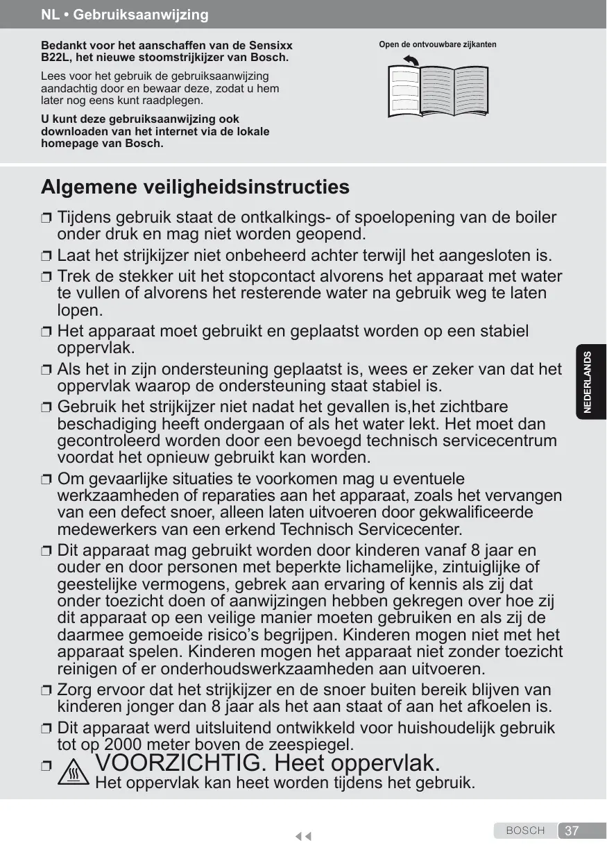 BOSCH NL • Gebruiksaanwijzing Bedankt voor het aanschaffen van de Sensixx B22L, het nieuwe stoomstrijkijzer van Bosch. Open de ontvouwbare zijkanten Lees voor het gebruik de gebruiksaanwijzing aandachtig door en bewaar deze, zodat u hem later nog eens kunt raadplegen. U kunt deze gebruiksaanwijzing ook downloaden van het internet via de lokale homepage van Bosch. Algemene veiligheidsinstructies ❐❐ Tijdens gebruik staat de ontkalkings- of spoelopening van de boiler BOSCH Nederlands onder druk en mag niet worden geopend. ❐❐ Laat het strijkijzer niet onbeheerd achter terwijl het aangesloten is. ❐❐ Trek de stekker uit het stopcontact alvorens het apparaat met water te vullen of alvorens het resterende water na gebruik weg te laten lopen. ❐❐ Het apparaat moet gebruikt en geplaatst worden op een stabiel oppervlak. ❐❐ Als het in zijn ondersteuning geplaatst is, wees er zeker van dat het oppervlak waarop de ondersteuning staat stabiel is. ❐❐ Gebruik het strijkijzer niet nadat het gevallen is,het zichtbare beschadiging heeft ondergaan of als het water lekt. Het moet dan gecontroleerd worden door een bevoegd technisch servicecentrum voordat het opnieuw gebruikt kan worden. ❐❐ Om gevaarlijke situaties te voorkomen mag u eventuele werkzaamheden of reparaties aan het apparaat, zoals het vervangen van een defect snoer, alleen laten uitvoeren door gekwalificeerde medewerkers van een erkend Technisch Servicecenter. ❐❐ Dit apparaat mag gebruikt worden door kinderen vanaf 8 jaar en ouder en door personen met beperkte lichamelijke, zintuiglijke of geestelijke vermogens, gebrek aan ervaring of kennis als zij dat onder toezicht doen of aanwijzingen hebben gekregen over hoe zij dit apparaat op een veilige manier moeten gebruiken en als zij de daarmee gemoeide risico’s begrijpen. Kinderen mogen niet met het apparaat spelen. Kinderen mogen het apparaat niet zonder toezicht reinigen of er onderhoudswerkzaamheden aan uitvoeren. ❐❐ Zorg ervoor dat het strijkijzer en de snoer buiten bereik blijven van kinderen jonger dan 8 jaar als het aan staat of aan het afkoelen is. ❐❐ Dit apparaat werd uitsluitend ontwikkeld voor huishoudelijk gebruik tot op 2000 meter boven de zeespiegel.